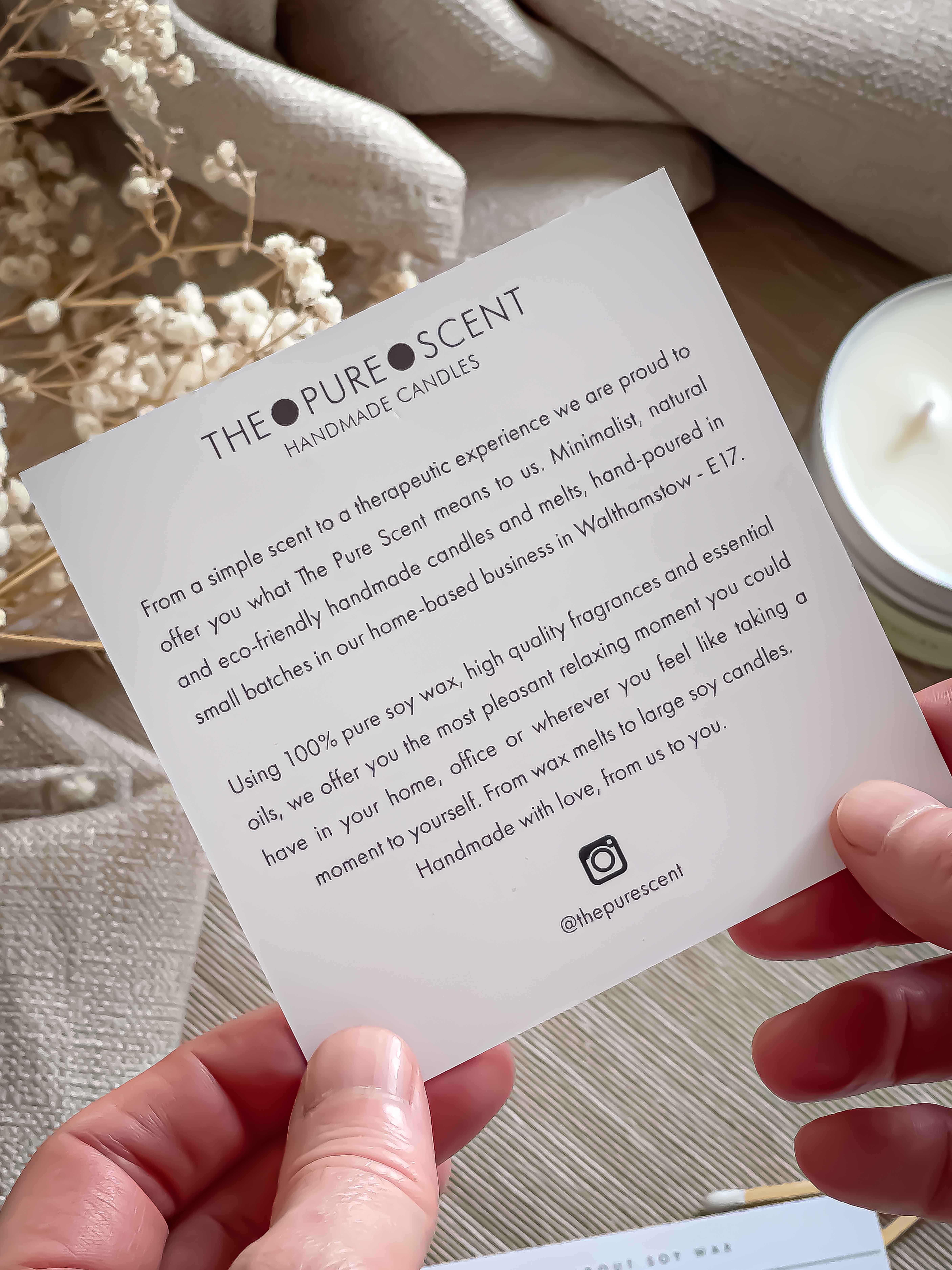 Welcome to The Pure Scent Handmade Candles. This minimalist candle made of 100 % pure soy wax can only mean one thing: A pure, clean, and lasting burn. Hand-poured in small batches in Walthamstow -E17.