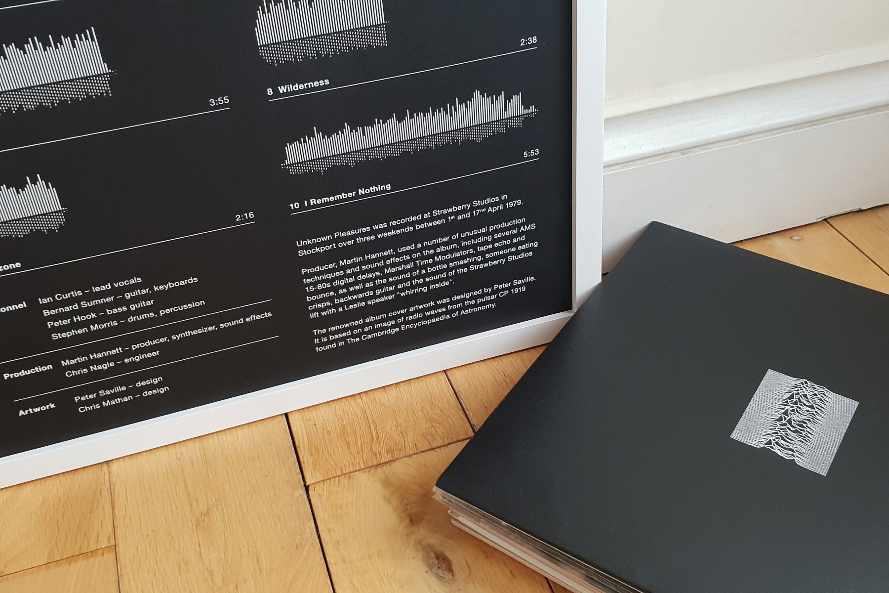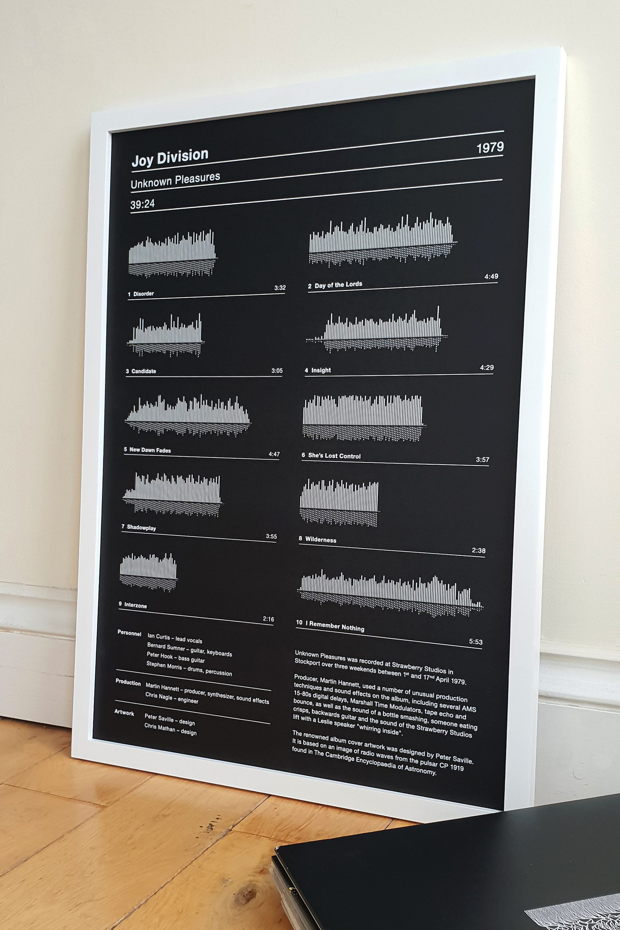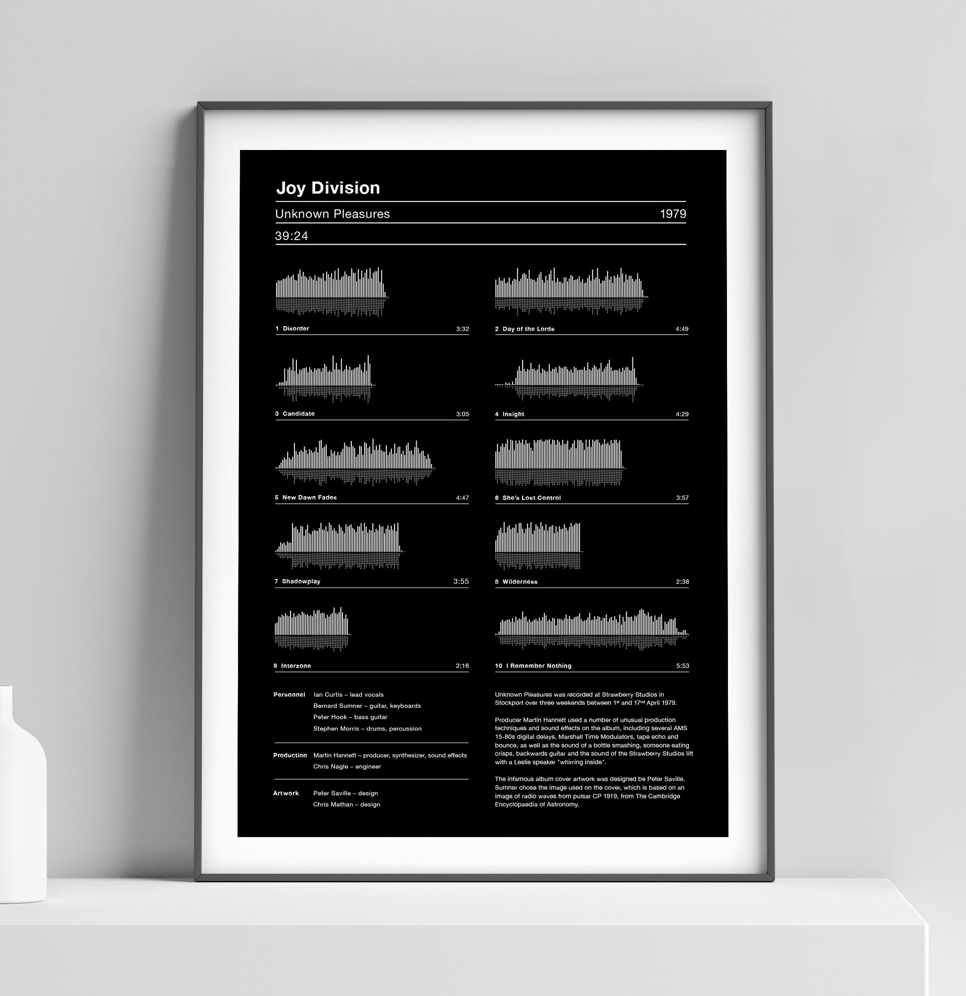 Joy Division Unknown Pleasures Print features a hand-pulled silkscreen design on high-quality black GF Smith paper stock with white ink detailing. This original art print by Serigrafica7585 showcases the vital information from Joy Division’s iconic debut album, released by Factory Records in 1979. Each track appears in running order with its corresponding sound wave and time duration, creating a striking visual representation. The minimalist black-and-white design pays homage to Peter Saville’s legendary Pulsar album cover. Music lovers and art collectors will appreciate this unique tribute to a post-punk masterpiece.
