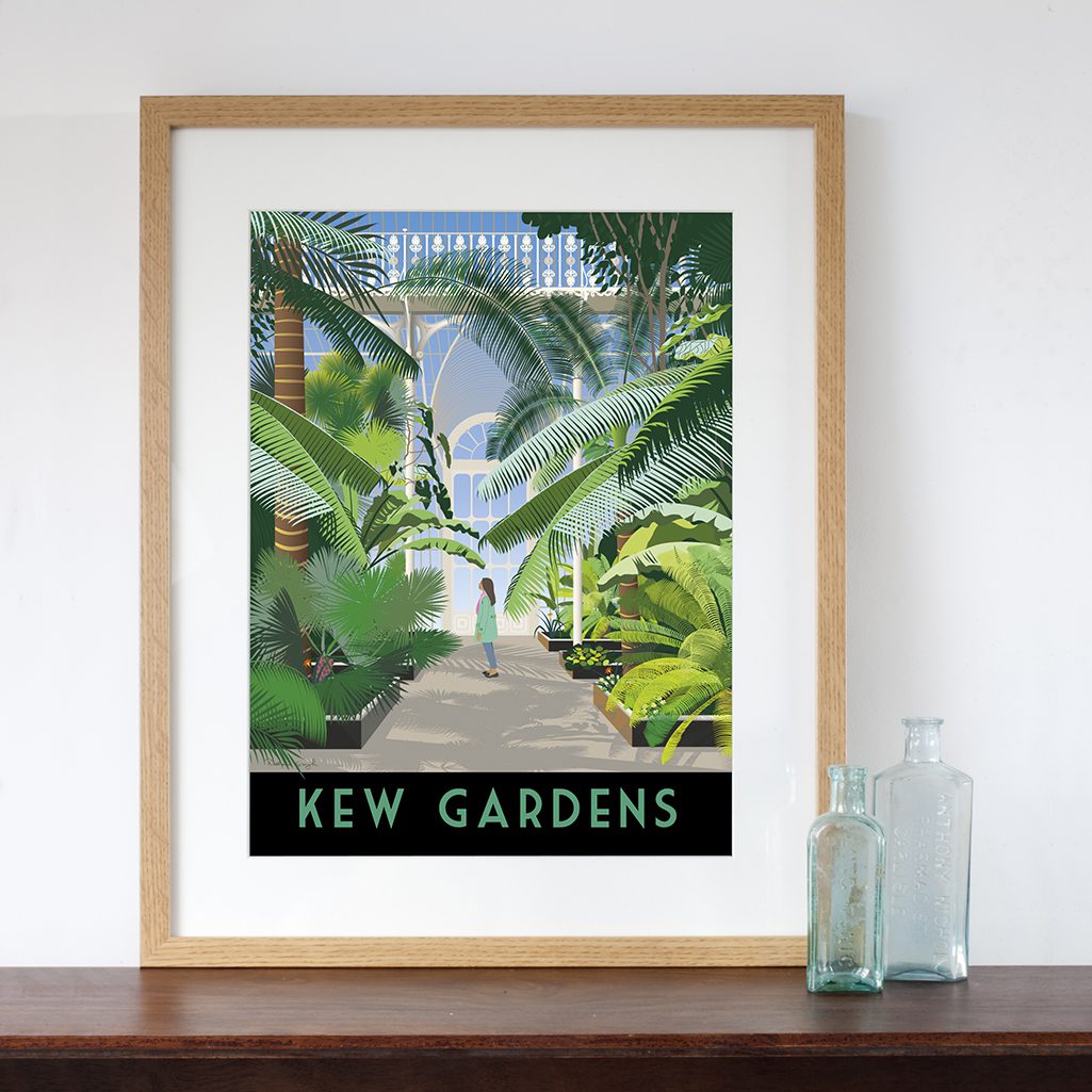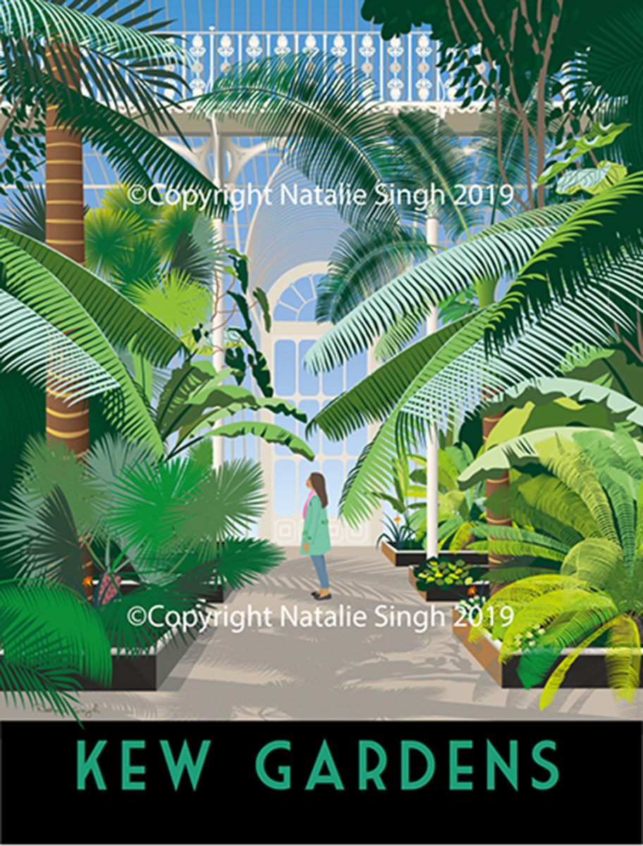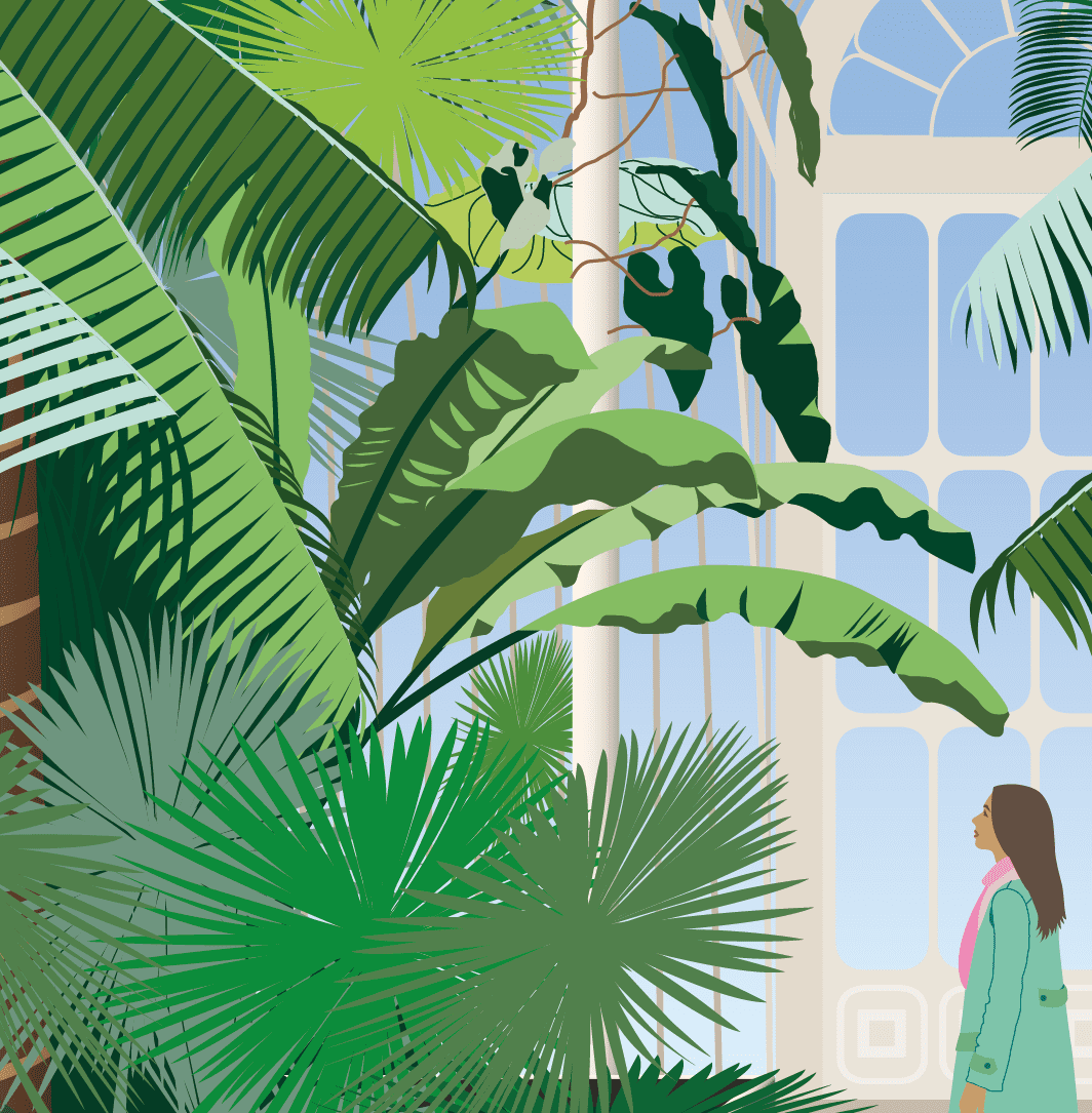 This illustration has been inspired by a recent visit to Kew, and has been drawn from one of my photos from this angle. I wanted to depict the scale of the plants next to a mere human, with them towering above our heads in their majesty and beauty, against a backdrop of Victorian iron and glass architecture.