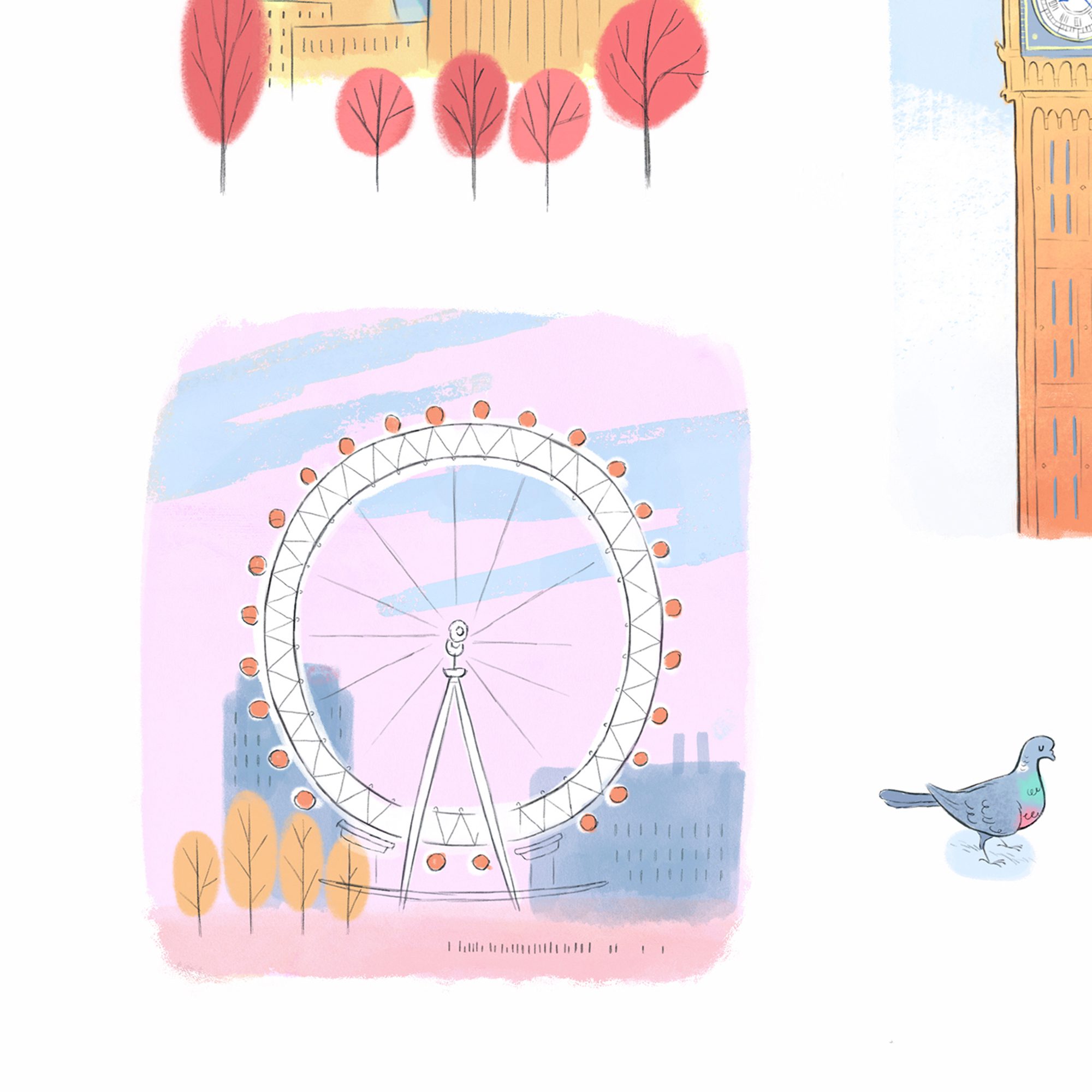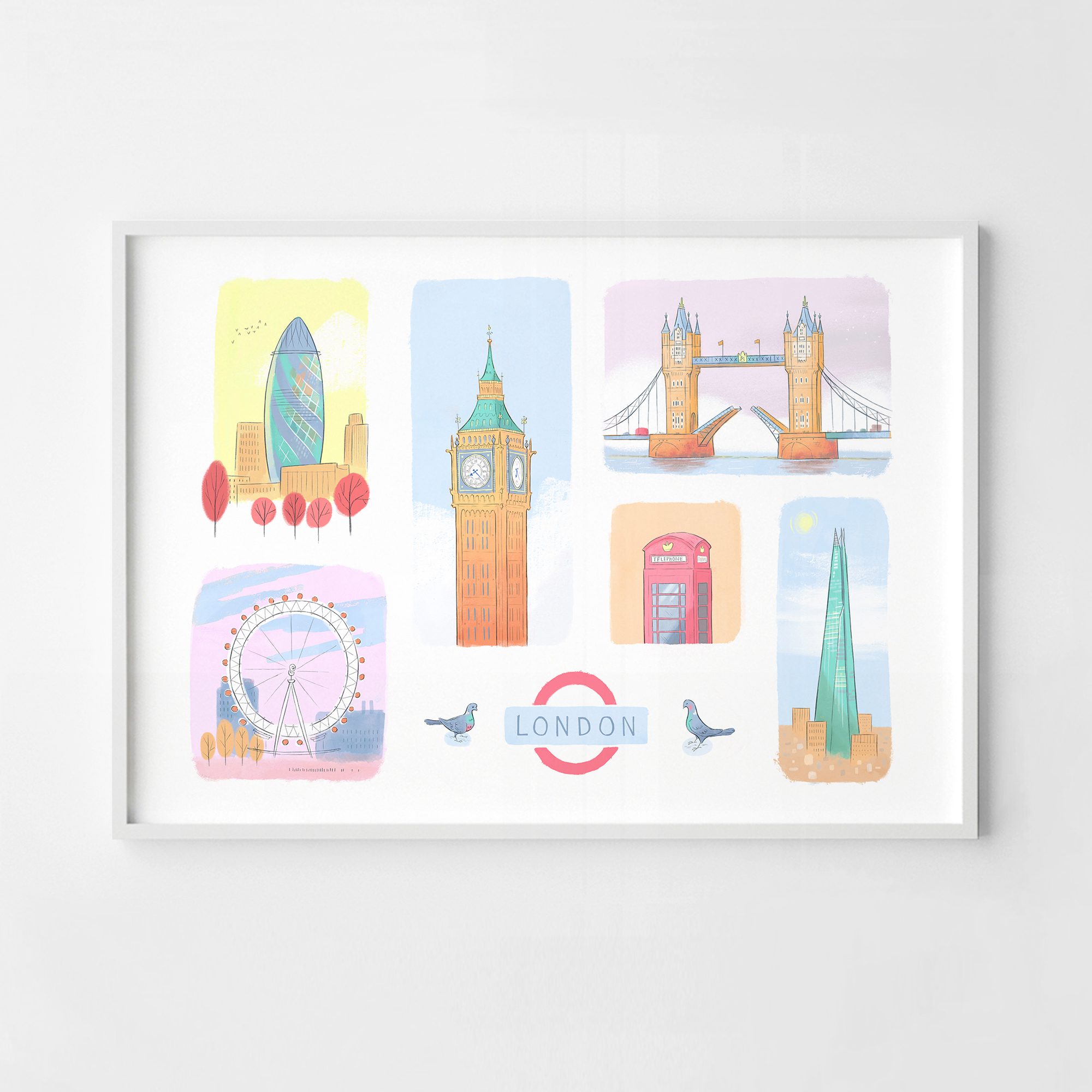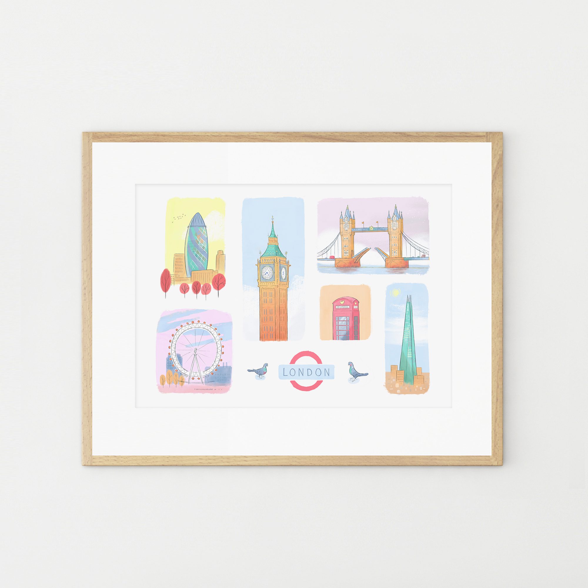 Five of London’s iconic landmarks, joyfully illustrated in this colourful fine art print. Perfect on your wall, or as a gift.