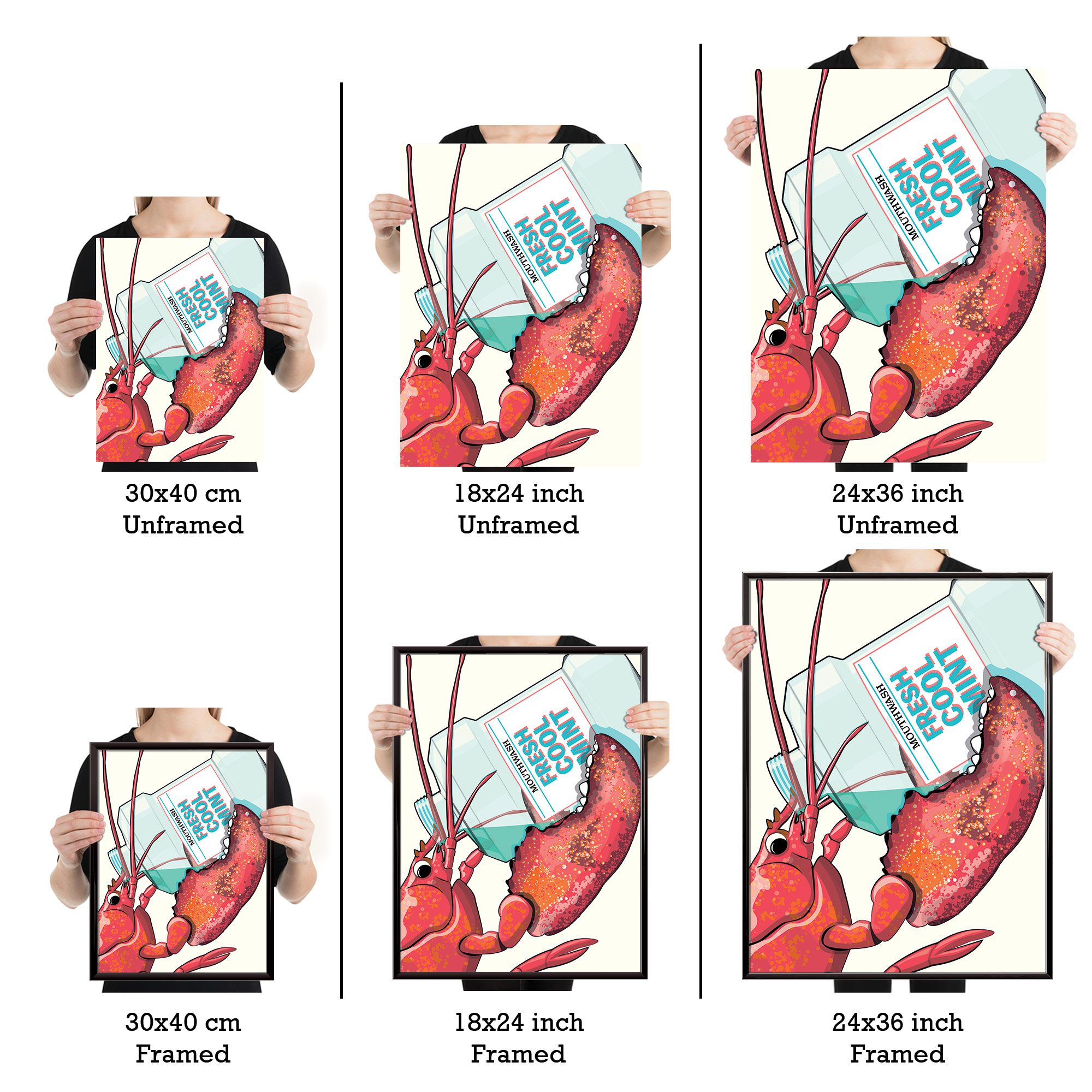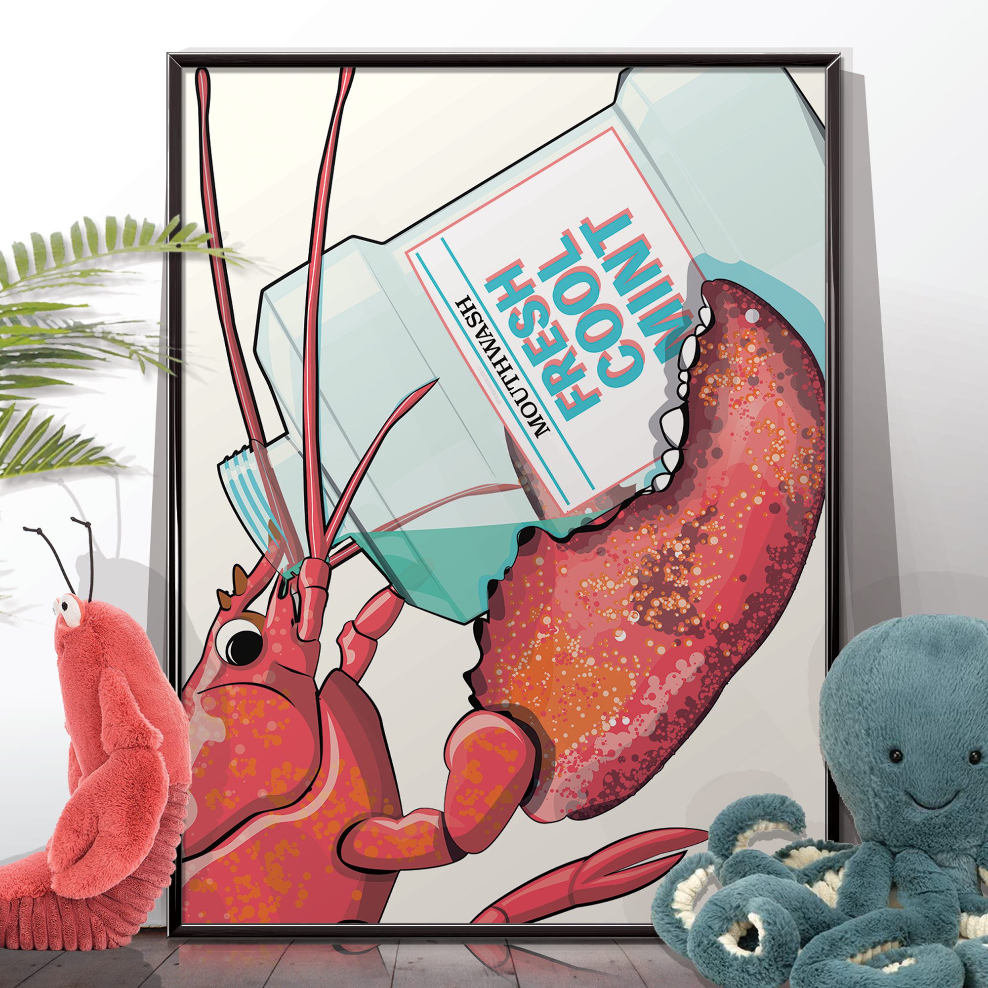 Lobster in the bathroom using mouthwash. If you’ve ever had a child, you’ll know that cleaning teeth can be a struggle, this poster is perfect to encourage or distract them!