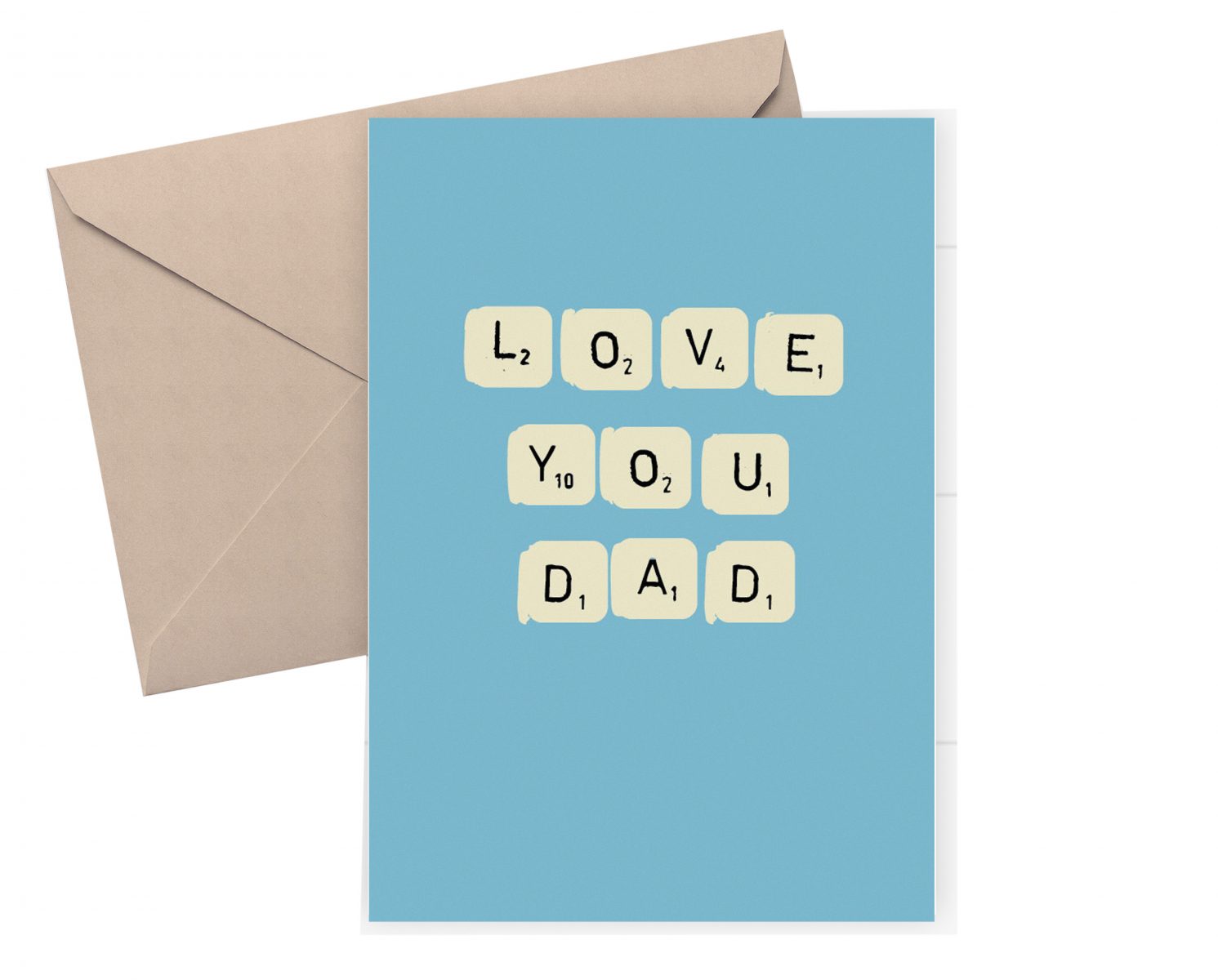 Crafted with care and attention to detail, this greeting card features a delightful Scrabble-inspired design with a blue background, creating stylish backdrop for your message of love and appreciation. The classic Scrabble tiles spell out the words “Love You, Dad,” adding a playful and nostalgic touch to the card.