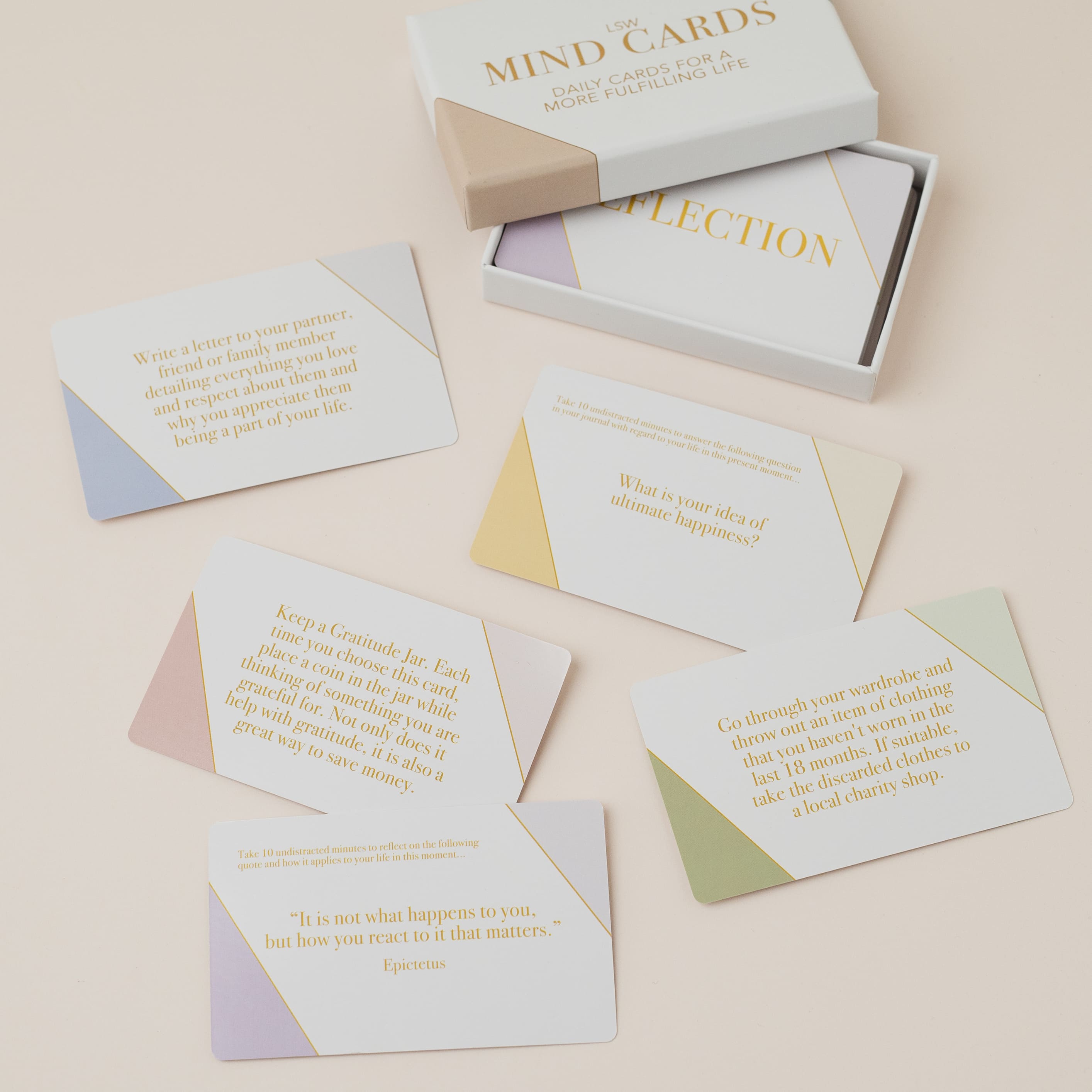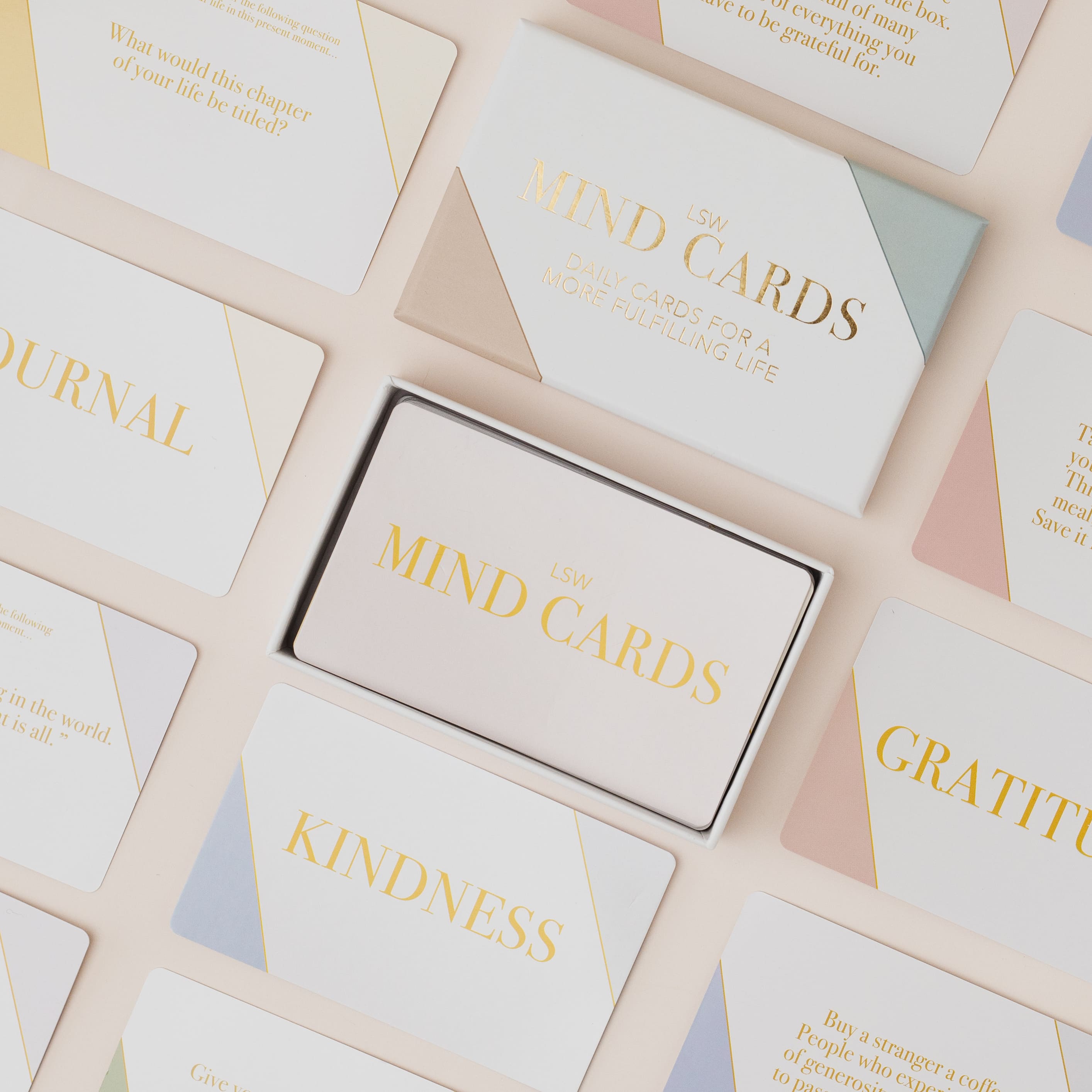 The set includes 45 uniquely designed LSW Mind Cards with rounded corners, presented in a beautiful lidded box. The cards are divided into five impactful categories that target different aspects of personal growth and mindfulness: