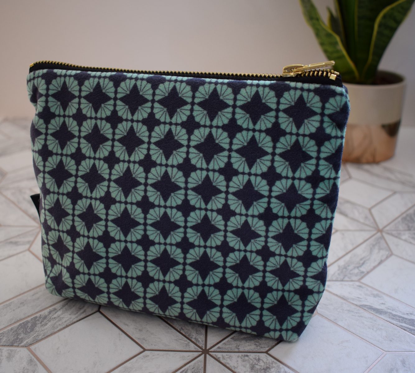 - Luxurious velvet makeup bag with an exquisite Art Deco fan pattern.