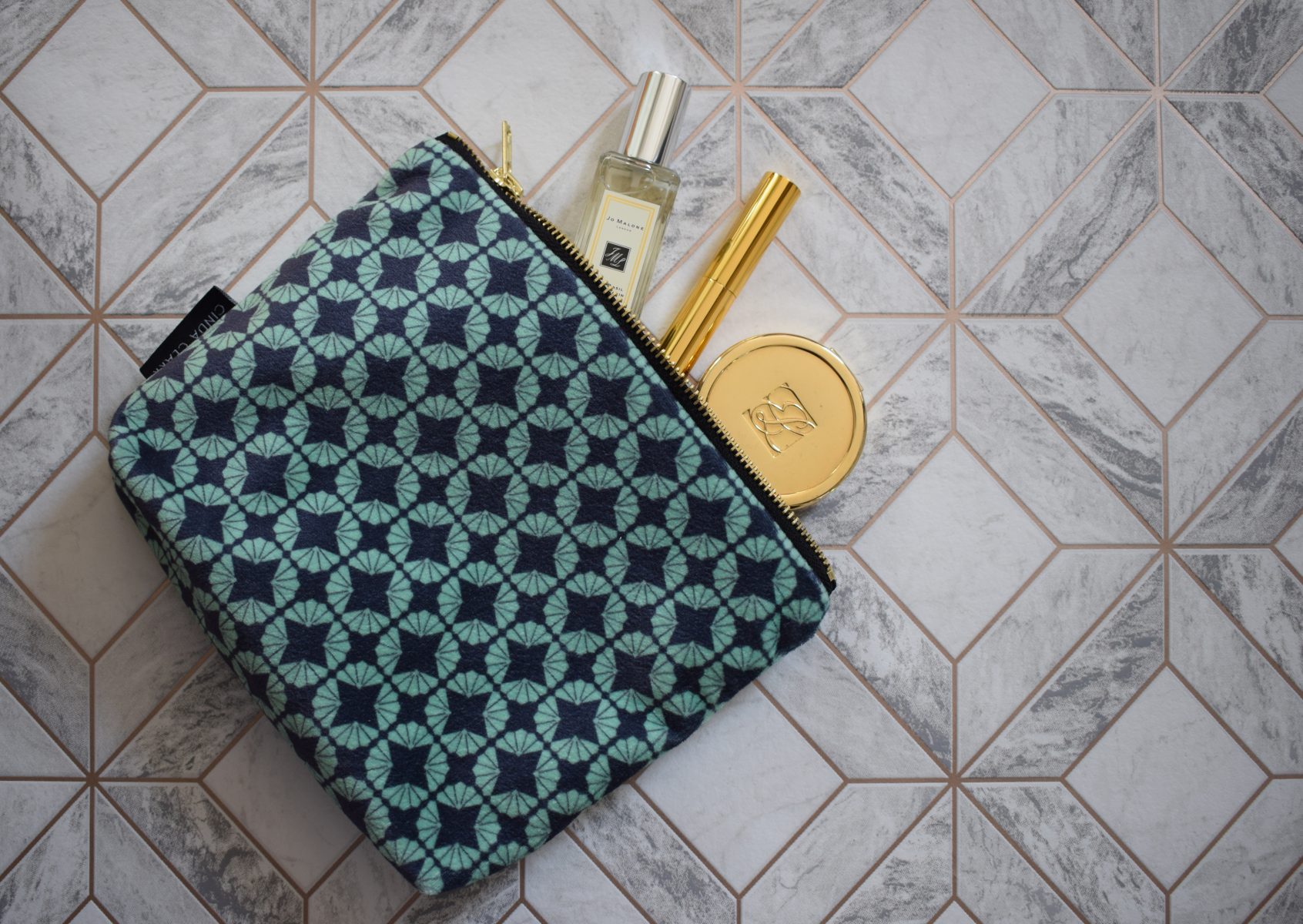 This makeup bag exudes opulence from every angle. The sumptuous velvet exterior feels soft to the touch and lends a sense of luxury, while the Art Deco fan pattern adds a timeless charm and a hint of vintage glamour.