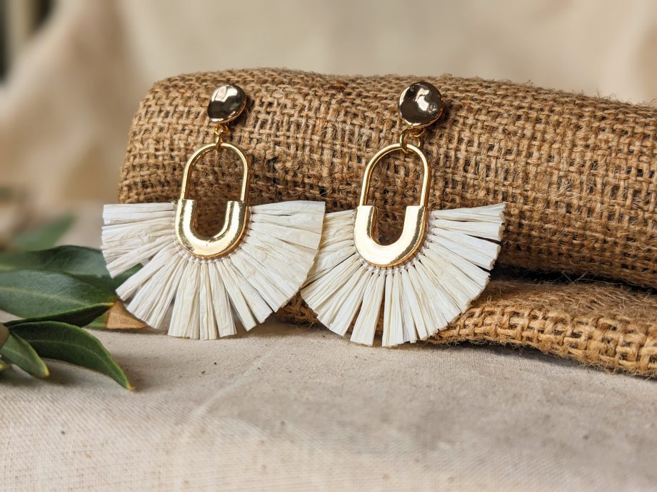 Step back in time with a modern twist with our Mallorca – White Raffia Art Deco Inspired Fan Earrings. These stunners are the perfect blend of yesteryear’s glam and today’s style, and they’re sure to turn heads wherever you go.
