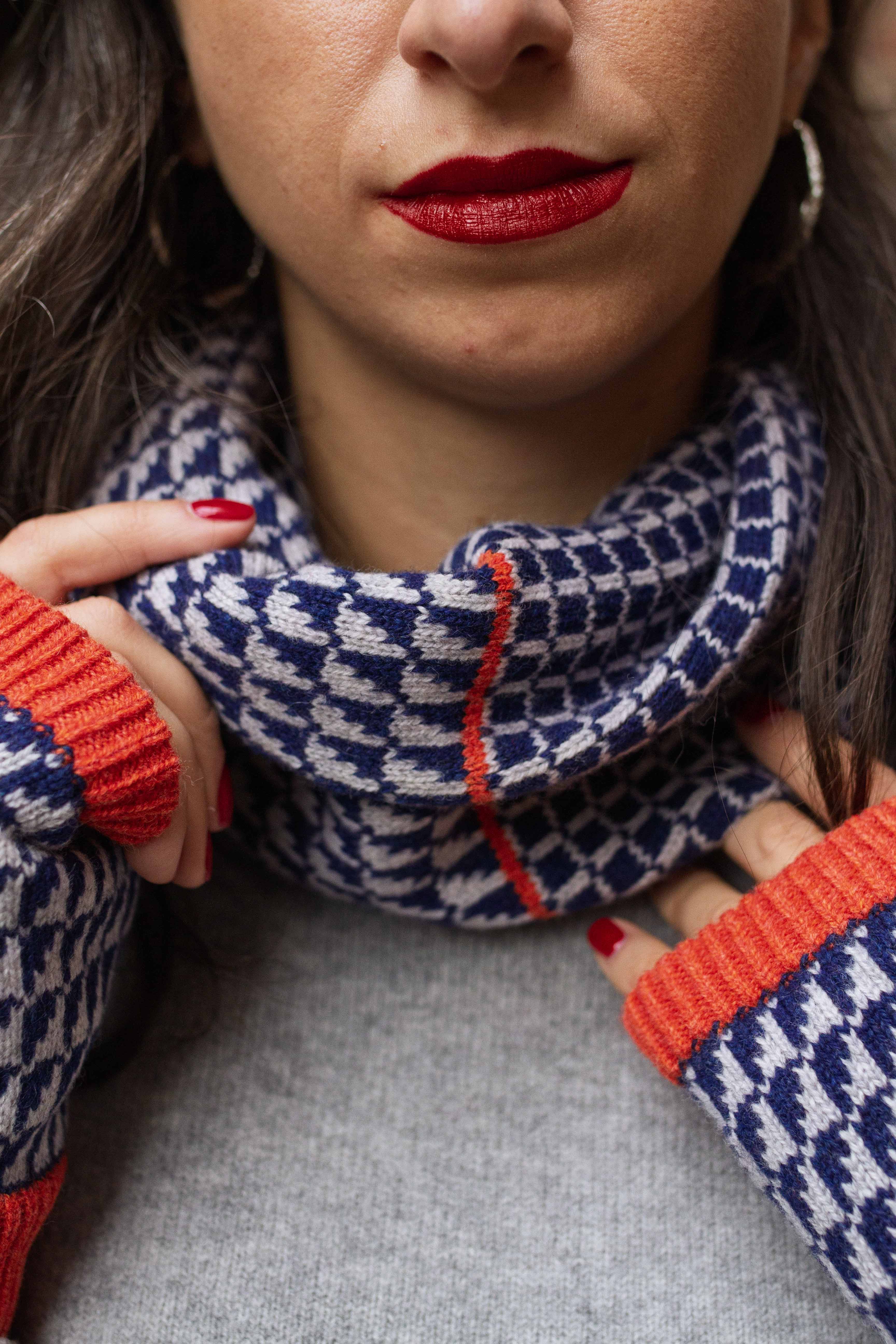 This navy and grey graphic snood is made individually and begins as a thread of luxury lambswool that I knit row by row using a vintage knitting machine. The snood is then hand finished ensuring no loose ends and then gently washed to ensure a supersoft feel.