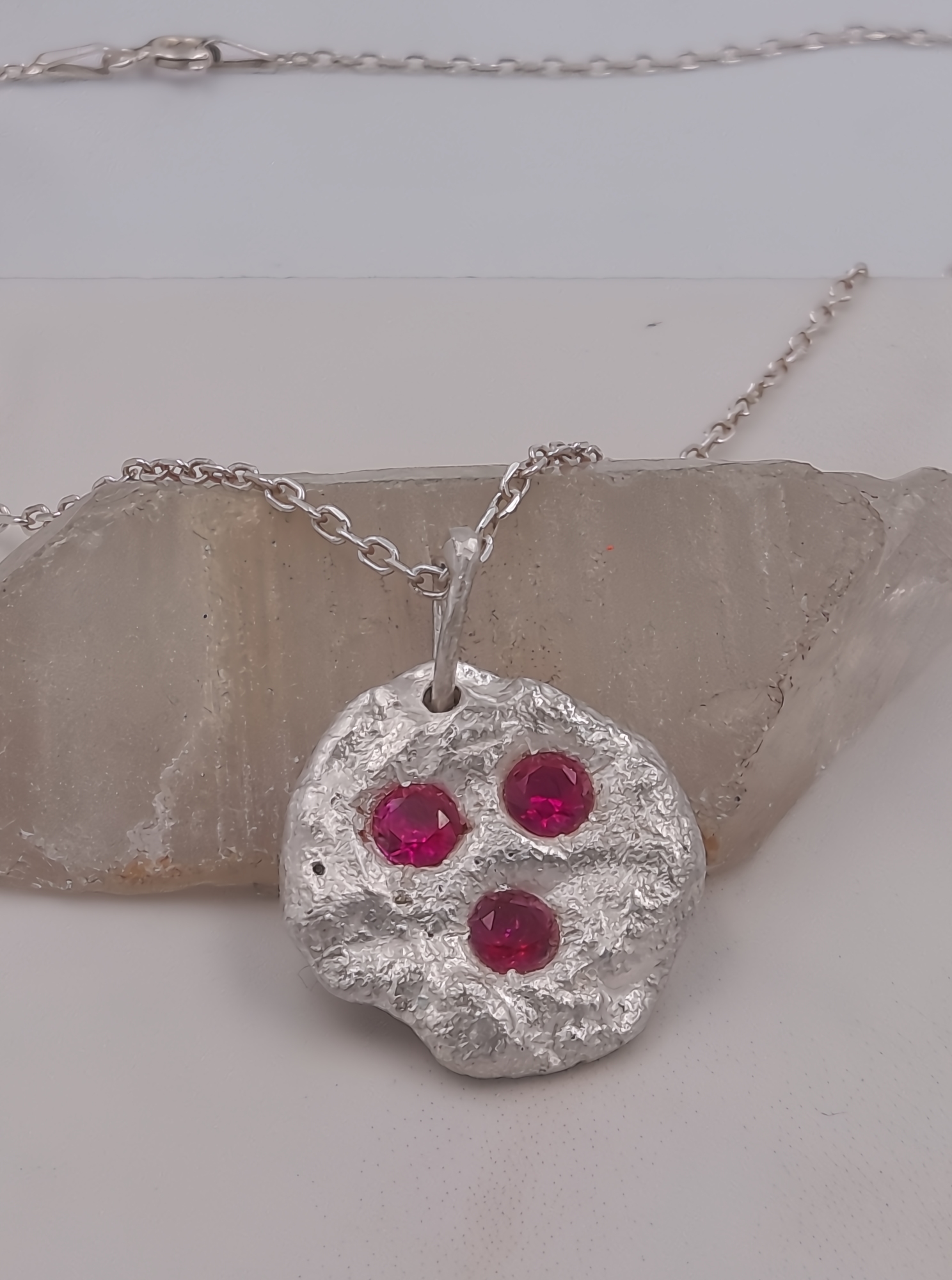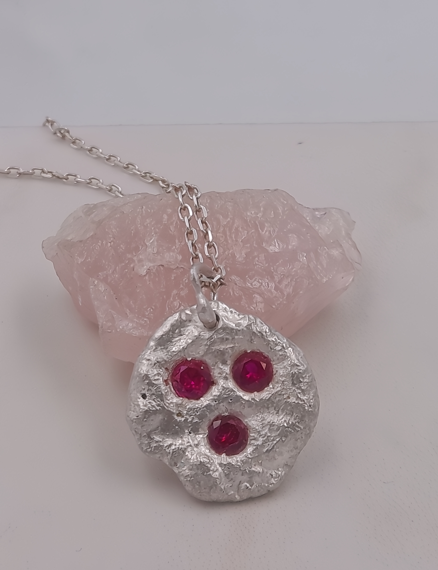 Nestled within the silver’s fluid embrace are three vibrant synthetic ruby gemstones. Their deep crimson hues adding a touch of passion and elegance to the piece. Suspended from a delicate yet durable sterling silver chain, this pendant is perfect for those who appreciate artisan craftsmanship and timeless beauty.