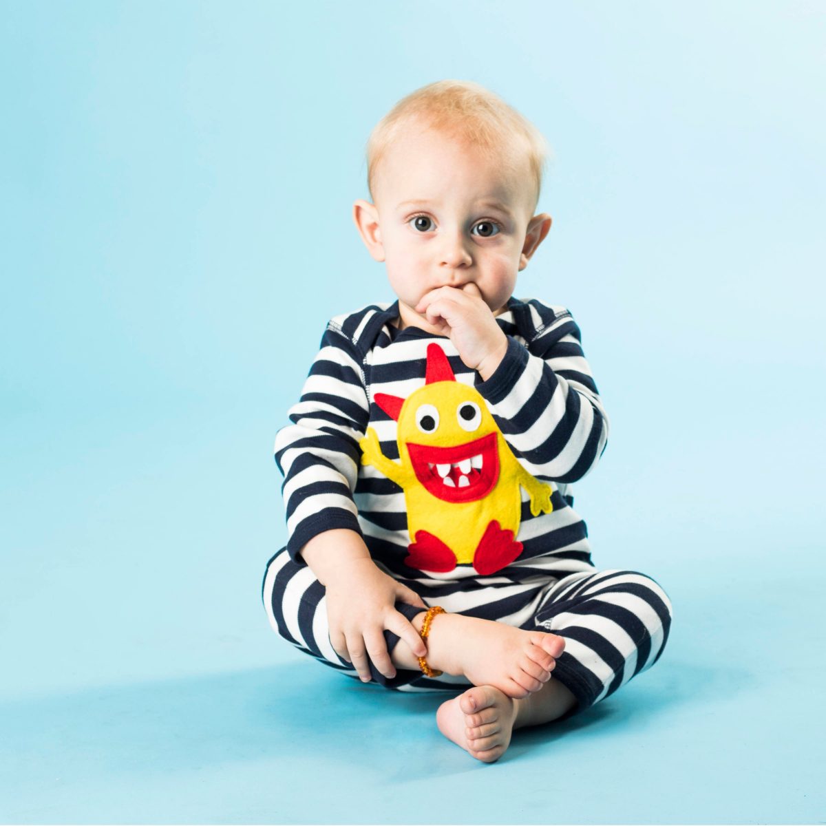 Snuggly soft and stretchy cotton that is gentle on the skin, the navy striped fair trade cotton romper has shoulder detailing and nickel free poppers for ease of changing. It features a hand crafted monster design that is made from machine washable polyester felt.