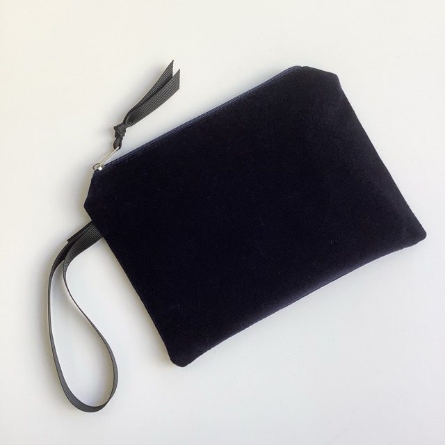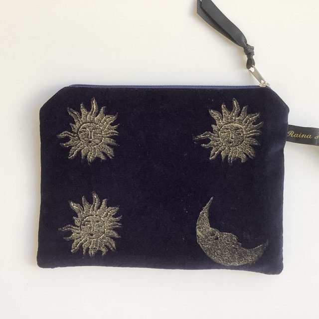 Introducing the exquisite Raina Atelier Navy Sun and Moon Velvet Zip-Up Pouch, a striking addition to your daily makeup routine and a unique accessory.