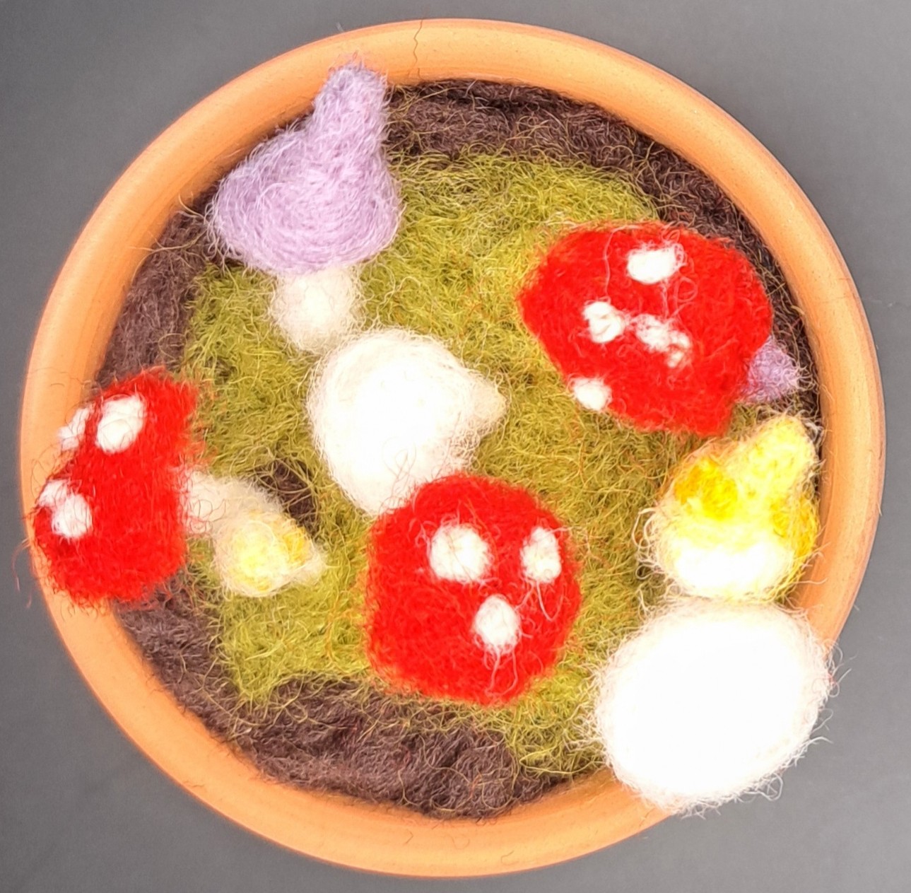 Nestled within the humble curve of a terracotta pot, this needle-felted mushroom arrangement invites the viewer into a quiet, imagined woodland where craft and contemplation meet.