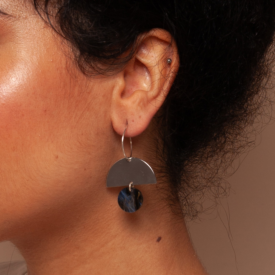 Nova Silver pairs a bold marbled blue acrylic circle with a silver half-moon, suspended from a delicate sterling silver hoop. The sterling silver hoop itself is handmade in North London, adding an extra layer of craft and care to this sculptural design. With its clean geometry and interplay of shape and texture, Nova brings architectural elegance softened by light and line.