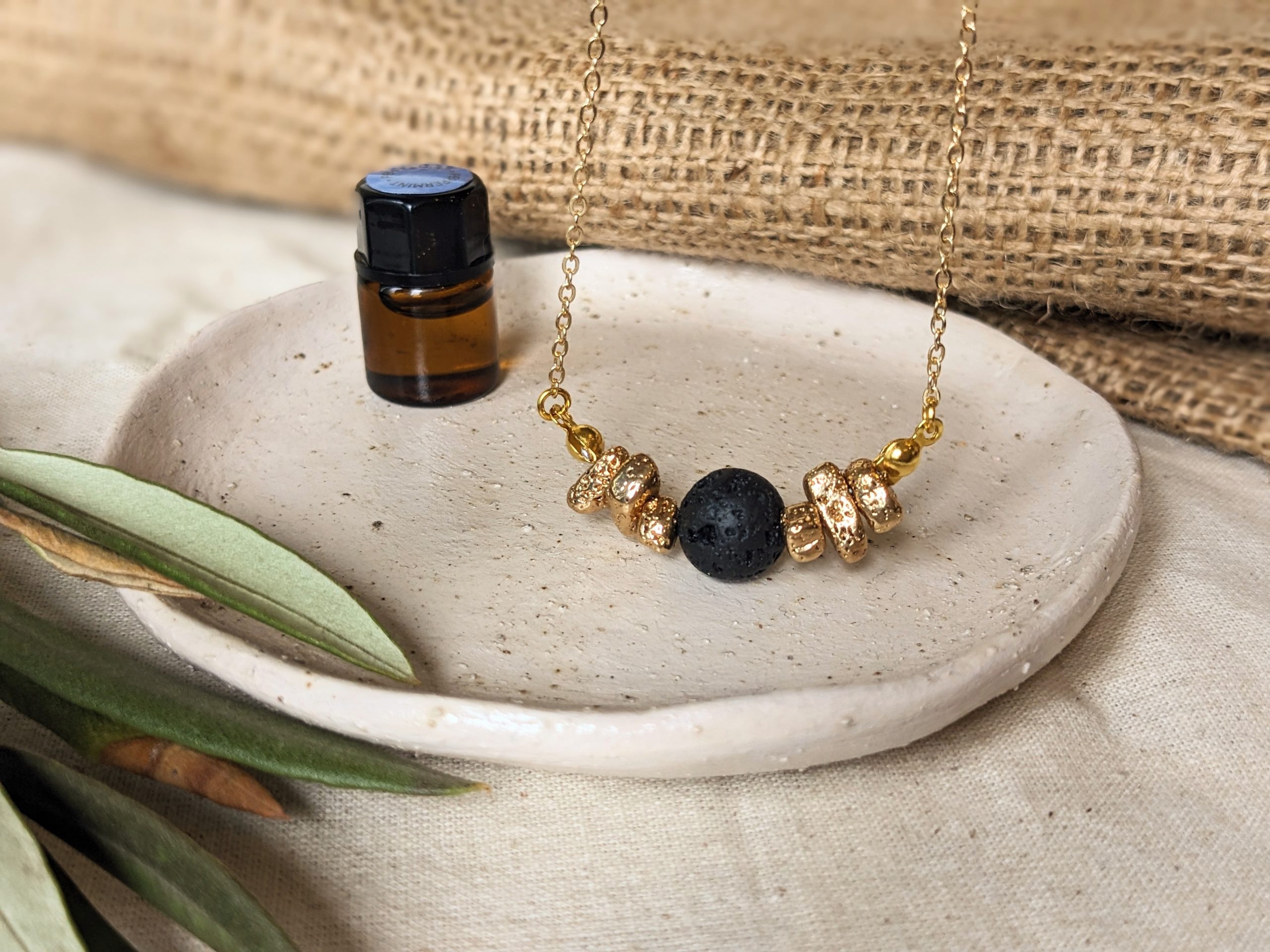 Simply add a few drops of your preferred essential oil to the lava bead, let it absorb, and enjoy a calming, personalised scent experience. The Gold Nugget necklace is perfect for enhancing your daily moments, offering you a discreet way to enjoy the therapeutic benefits of aromatherapy on the go. The necklace comes with 2 SAMPLES of doTERRA Essential Oils to get you started, but you can then apply your own essential oils.
