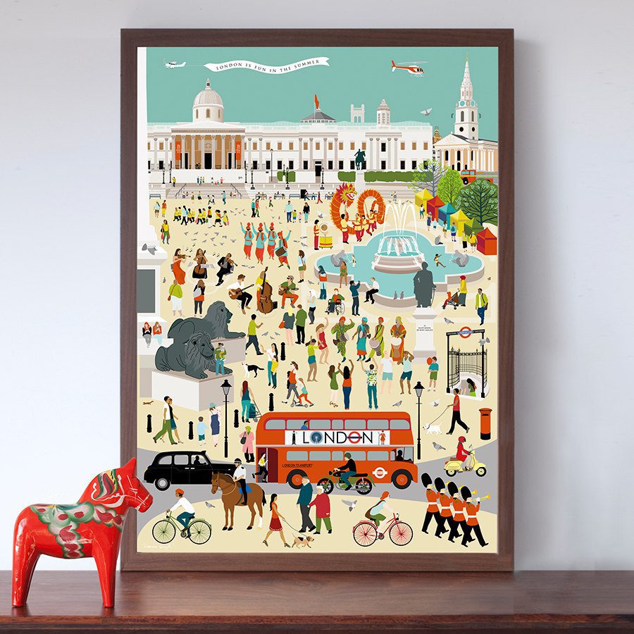 A brightly coloured and detailed illustration depicting London life in and around Trafalgar Square. Trafalgar Square is a hub of London life with its galleries, statues, amazing architecture and non-stop movement of people and traffic. It is a place to relax, meet friends or just pause and take stock. I’m inspired by the constant flow of people who go to see and hear the performers and musicians in the Square everyday.