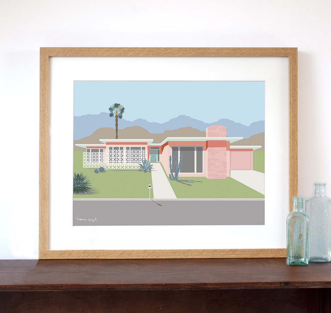Creative, digital art print of a Mid-Century Modern Flat-roofed style house as seen in Palm Springs. This illustration combines typical elements of Mid-Century Modern Architecture and is inspired by the iconic flat roofline design, and the very retro breeze-blocks. I love the desert flora and have included a few here.