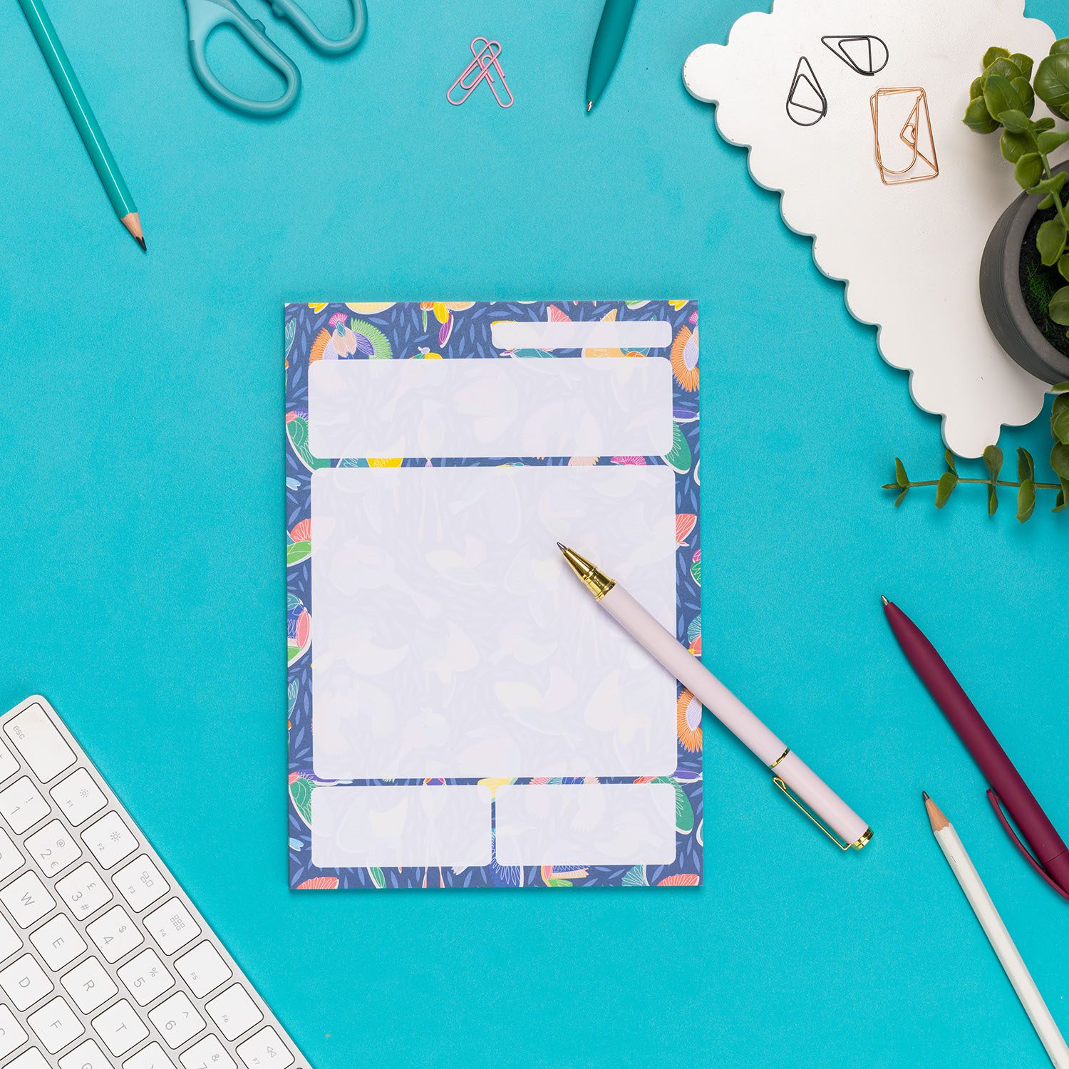 This beautifully designed planner features intricate hand-drawn bird motifs with vibrant color accents and energetic swirls of smaller leaves. The elegant design makes planning more enjoyable and keeps your workspace visually appealing. Furthermore, this planner pad belongs to a broader collection that includes an A4 Planner Pad, an A5 dot-grid notebook and A6 notepad.