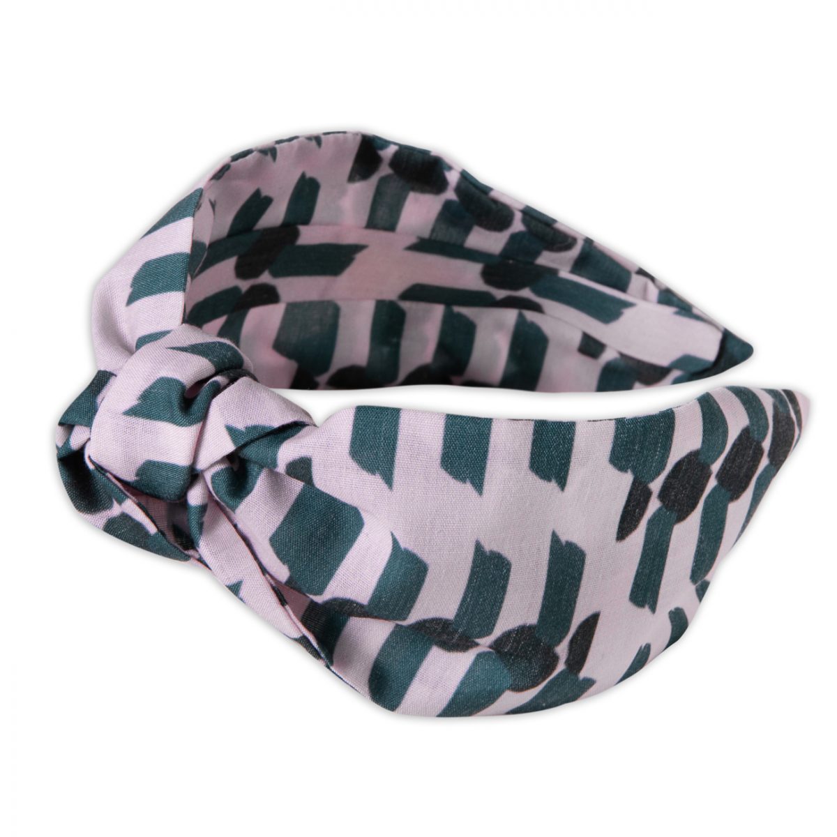 Light cotton Kate Whyley knotted headband with green and pink design – Peony