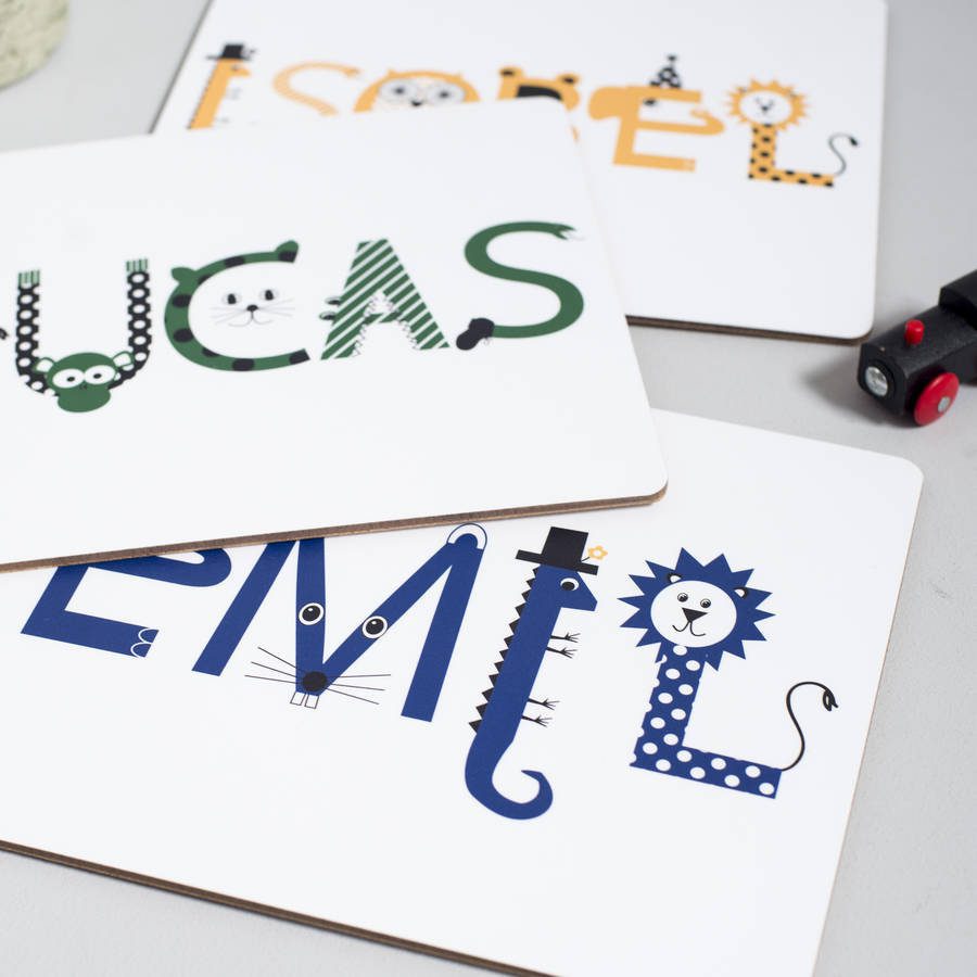 Make mealtime more fun with this personalised children’s placemat, featuring the name of your child illustrated by wonderful animal characters. This unique placemat transforms mealtime into an exciting adventure, as each letter in your child’s name is represented by an animal starting with that same letter. For example, if your child’s name includes two of the same letter, each animal character will be distinctly different, adding variety and fun.