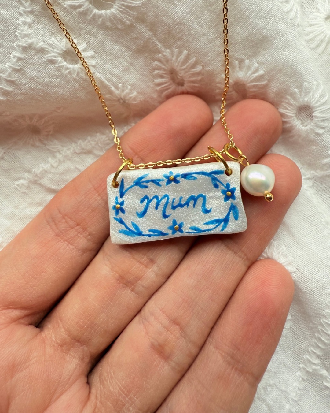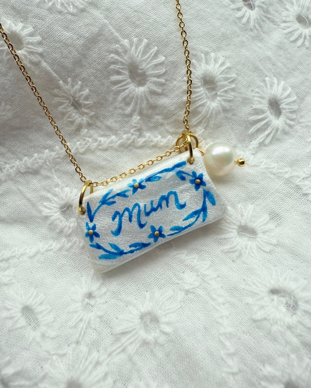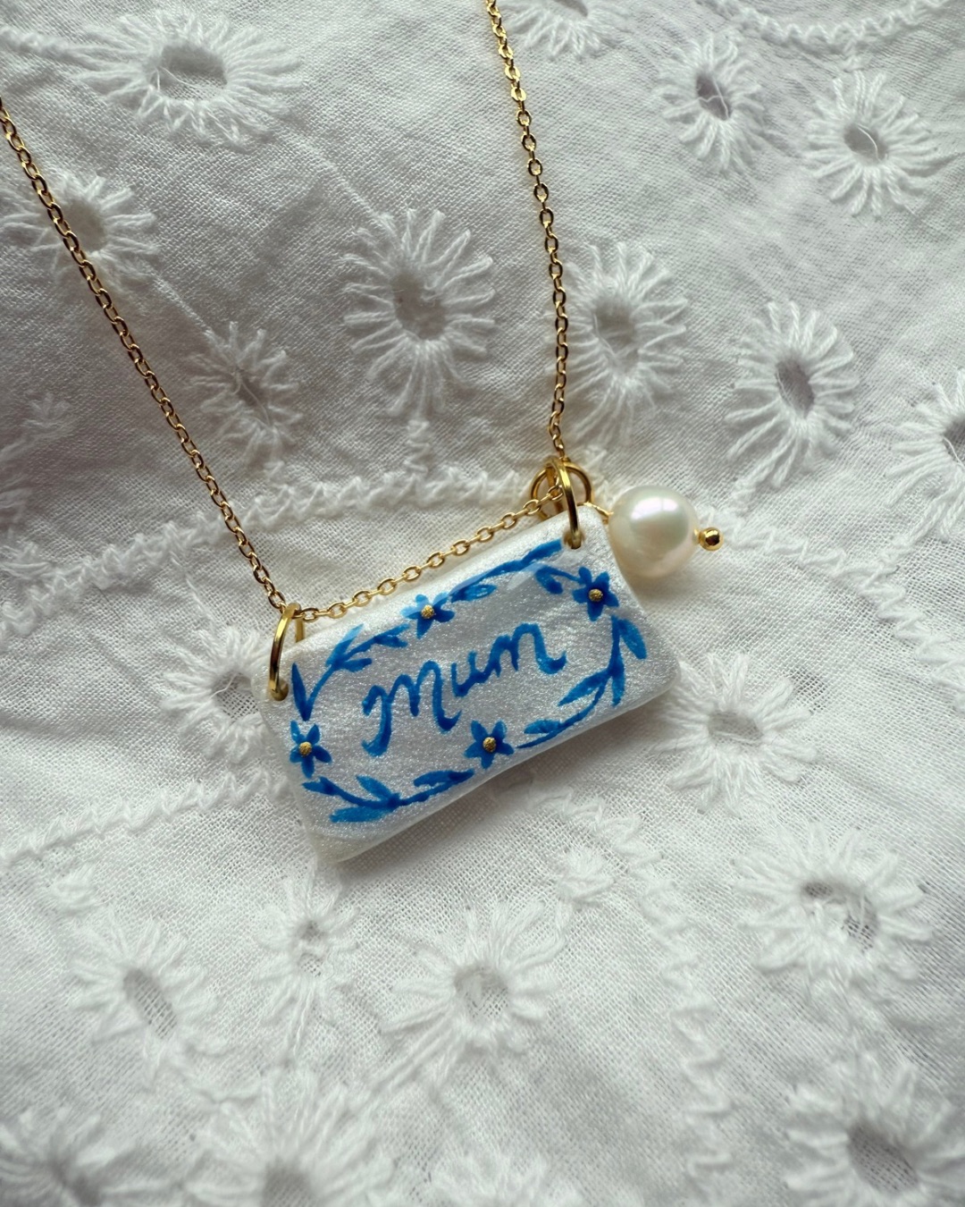 A delicate rectangular pendant necklace, hand-painted with care and personalised with a name that holds meaning — Mum, Mama, Nan or another chosen word.