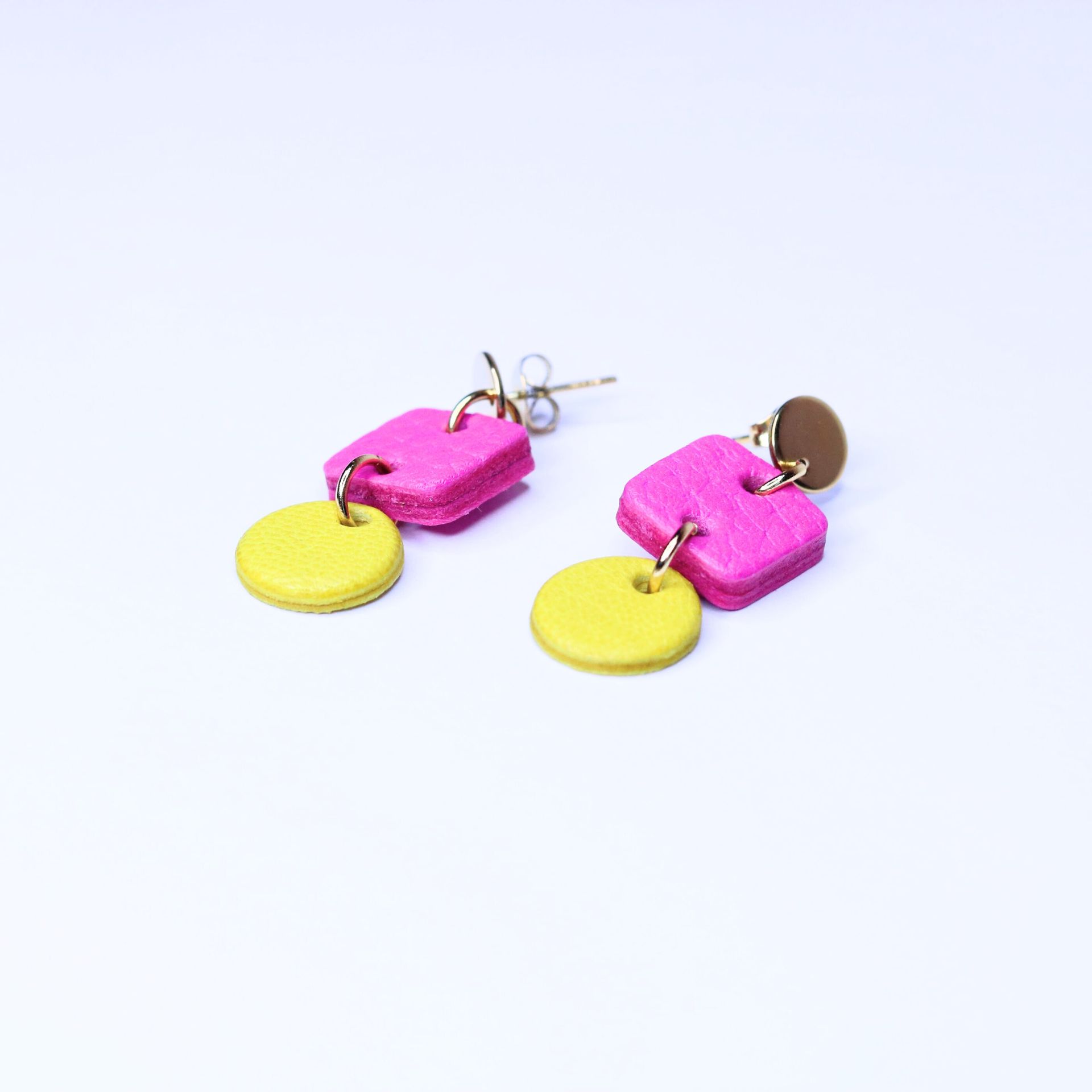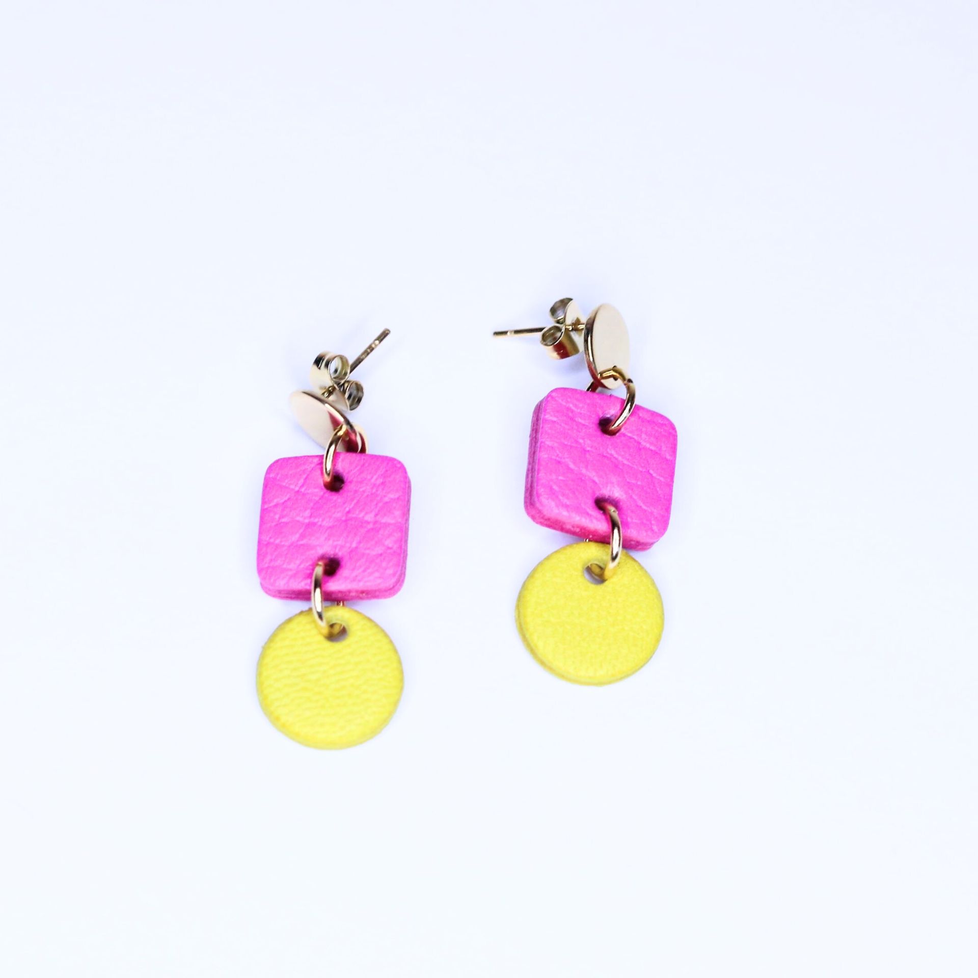 Bring playful energy to your look with these small but powerful Pink and Yellow Geometric Earrings. Combining two bold, joyful colours—pink and yellow—this vibrant double-sided design adds instant impact in a compact, stylish shape. The clean geometry offers a modern, minimalist edge, making them a chic and versatile accessory for any occasion.