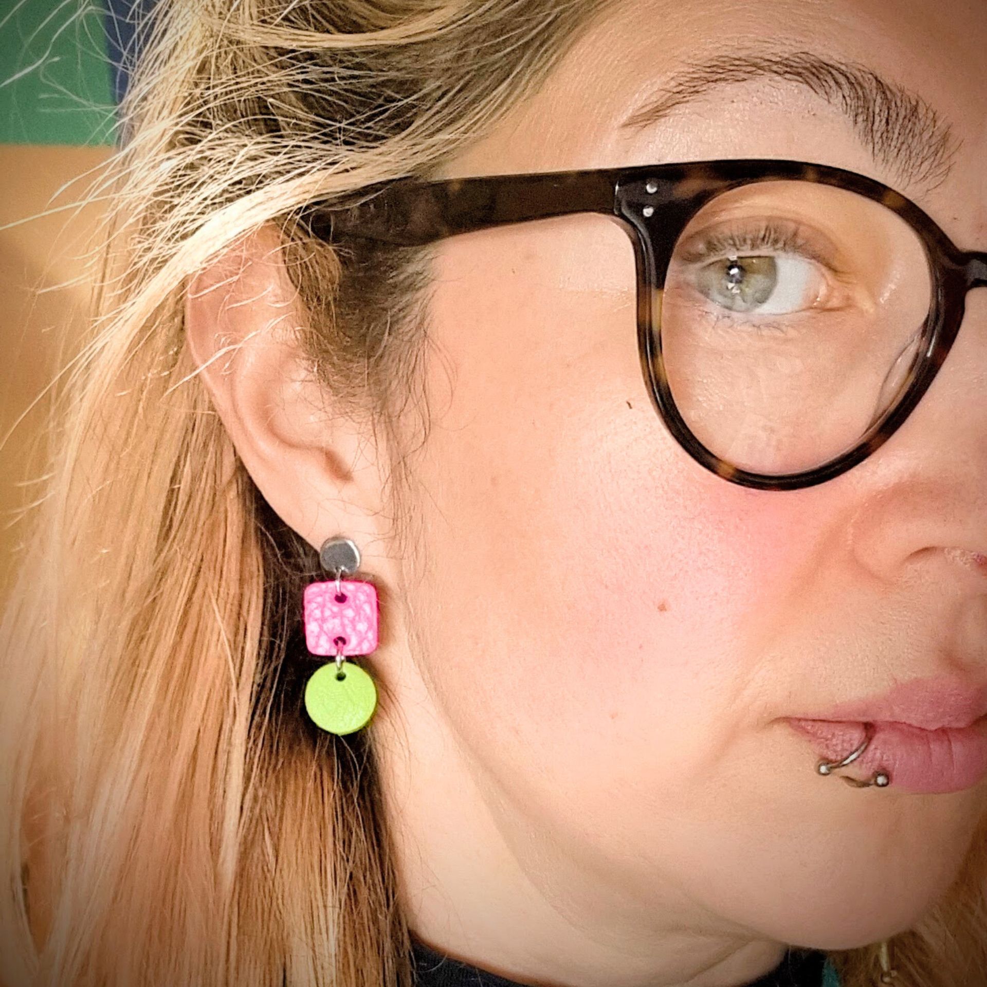 Pink and Yellow dangly earrings made from leather offcuts and stainless steel.