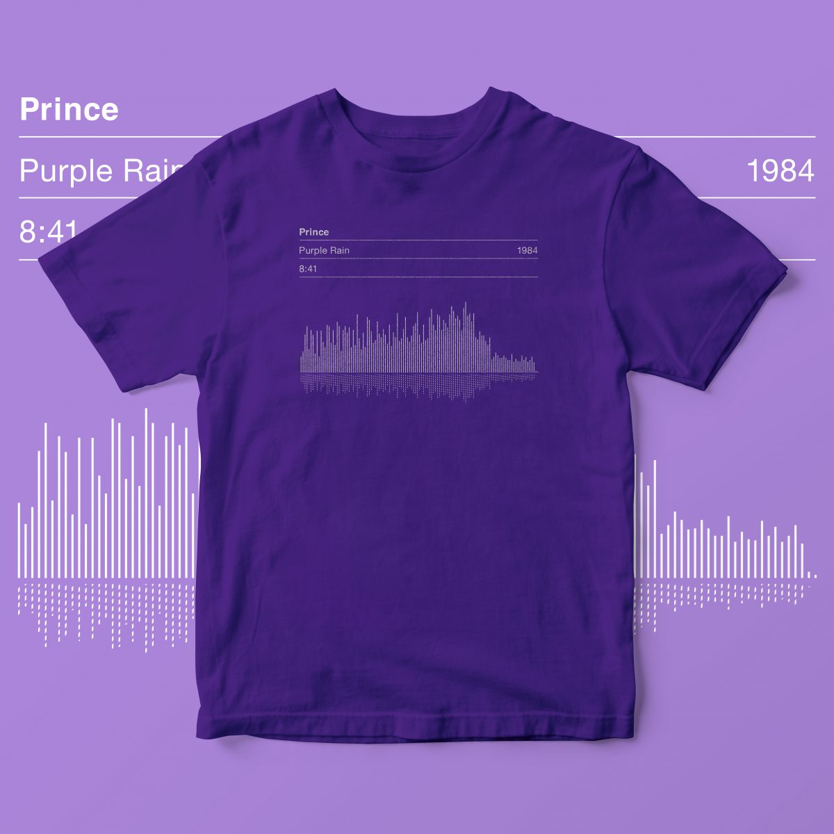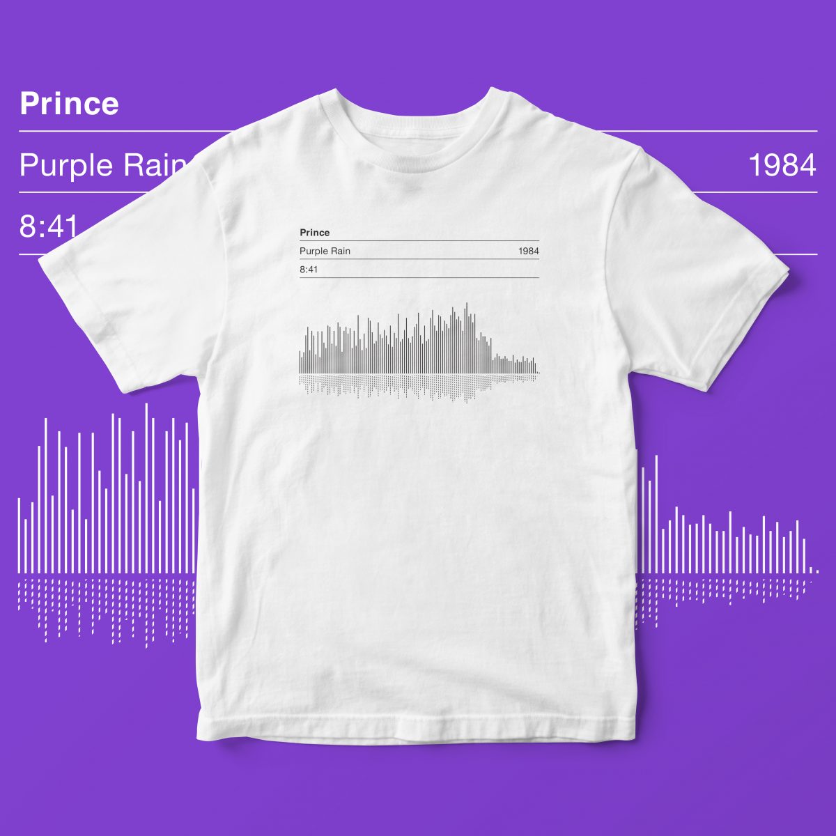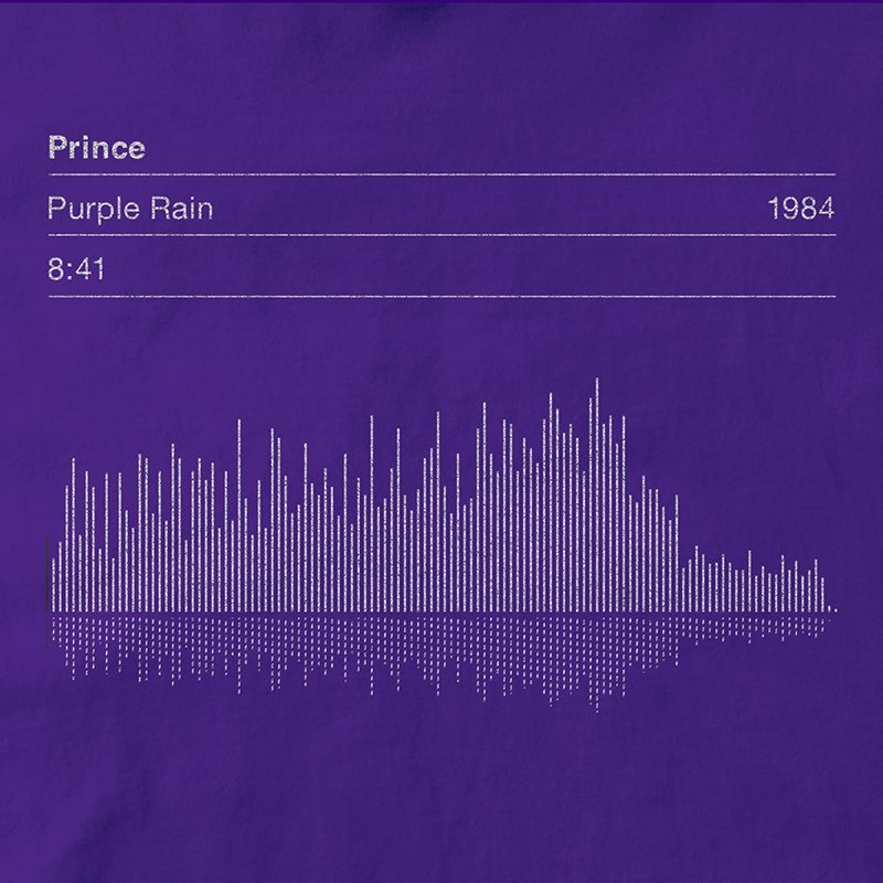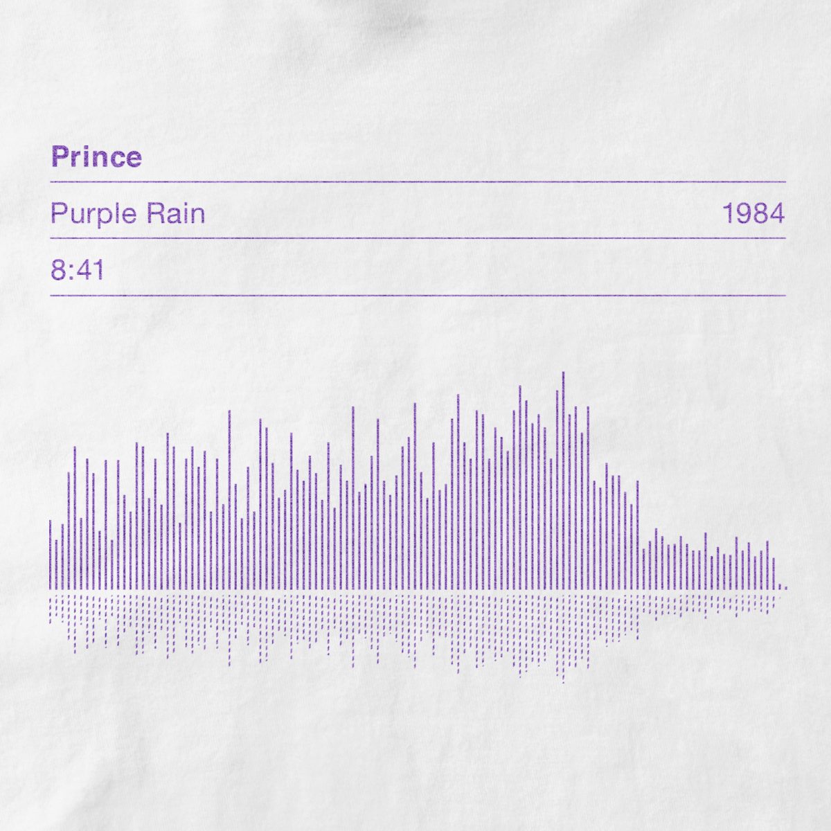 This a hand screen printed crew neck T-shirt featuring an original Serigrafica7585 design. The T-shirt displays the vital info including song title, song length, date of release and dynamic sound wave for Prince’s classic 80’s hit ‘Purple Rain’.