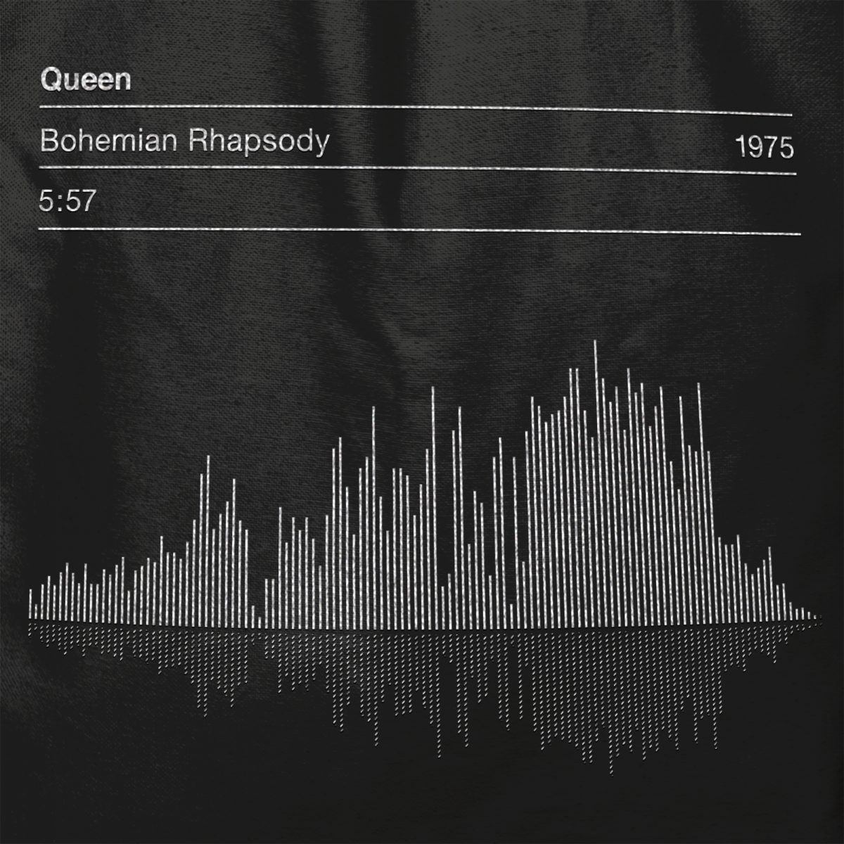 Queen Bohemian Rhapsody Sound Wave T-shirt showcases an original hand-screen-printed design featuring the legendary song’s visual representation. The T-shirt highlights essential details, including the track length and the release date, emphasizing the song’s historical significance. Designed meticulously, it serves as a tribute to one of the greatest rock anthems ever created.