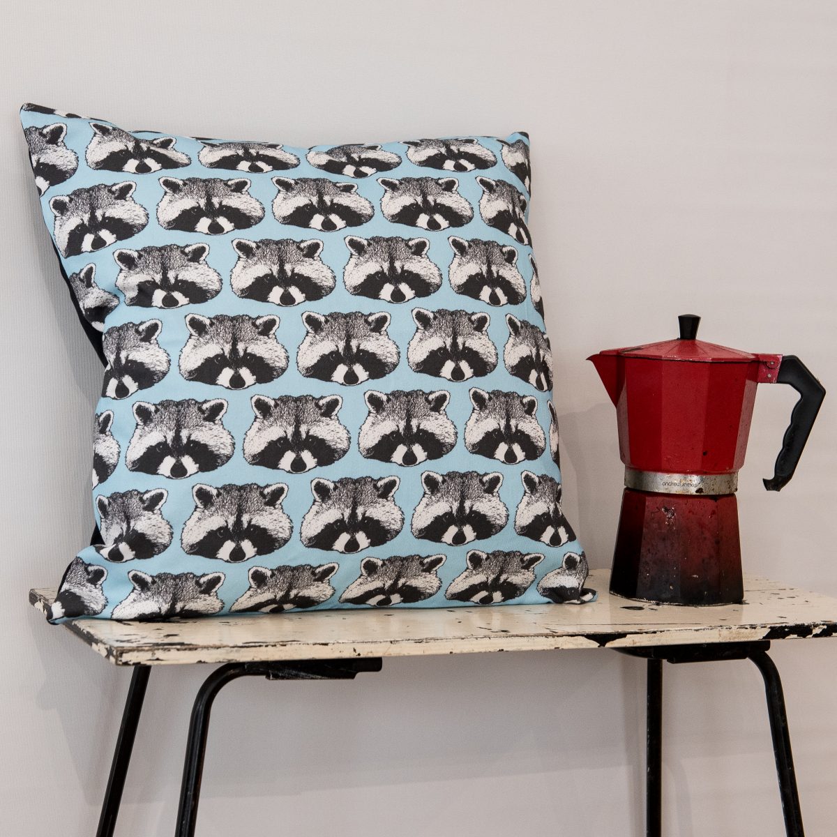 Raccoon Print Cushion – animal print cushion – Raccoon design – kids cushion – throw pillow – scatter cushion – animal homeware – illustration – lino print – patterned cushion – homeware