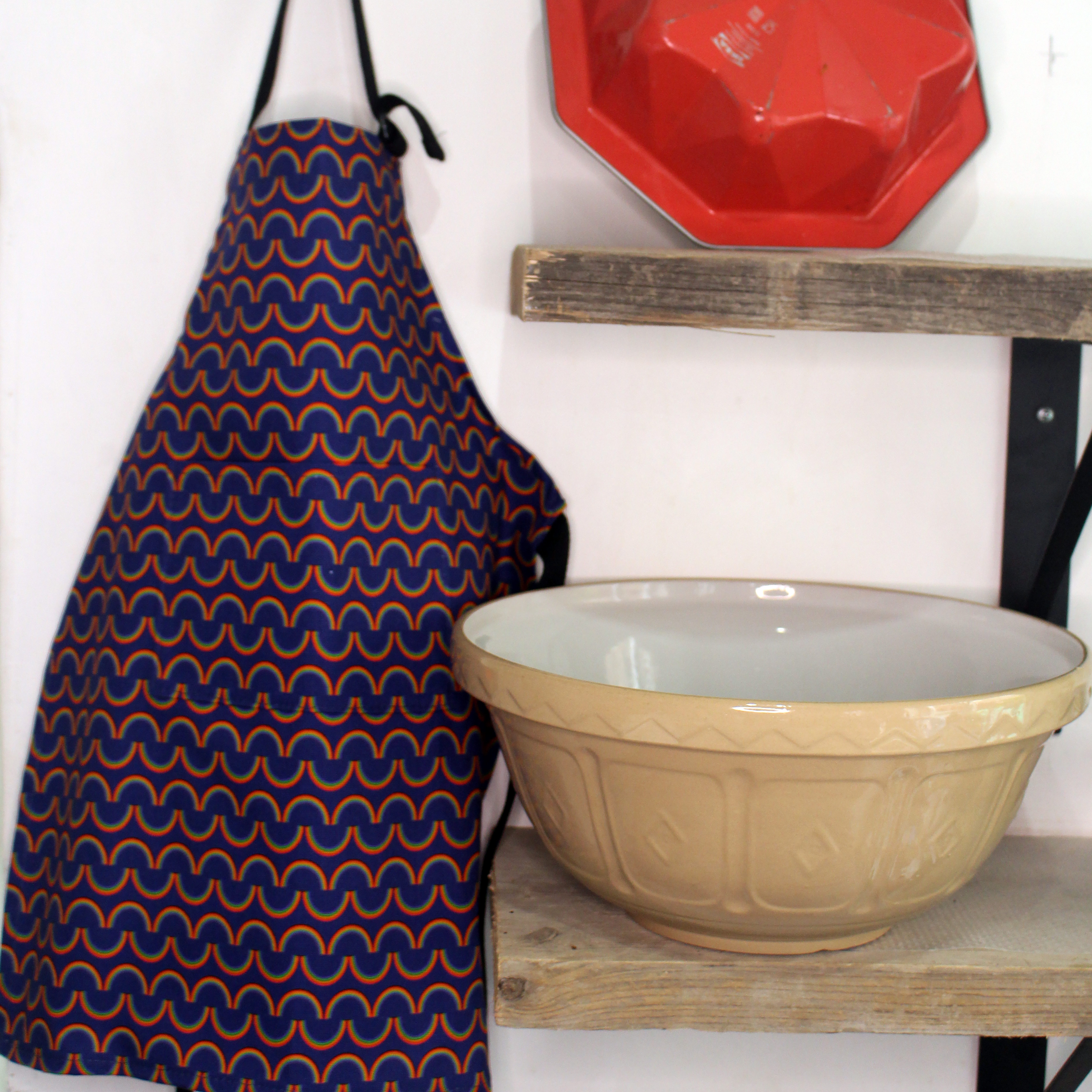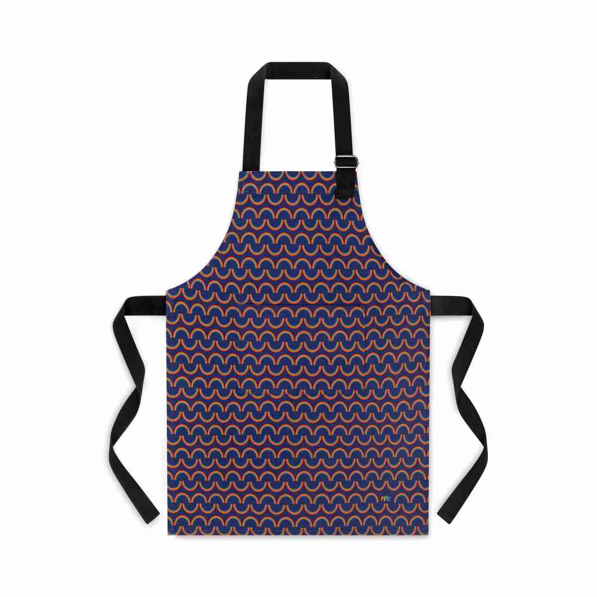 Vibrant Rainbow Stripes on a rich deep navy background adorn this luxury organic cotton apron with a secure adjustable metal buckle on the neck strap and a sturdy pocket