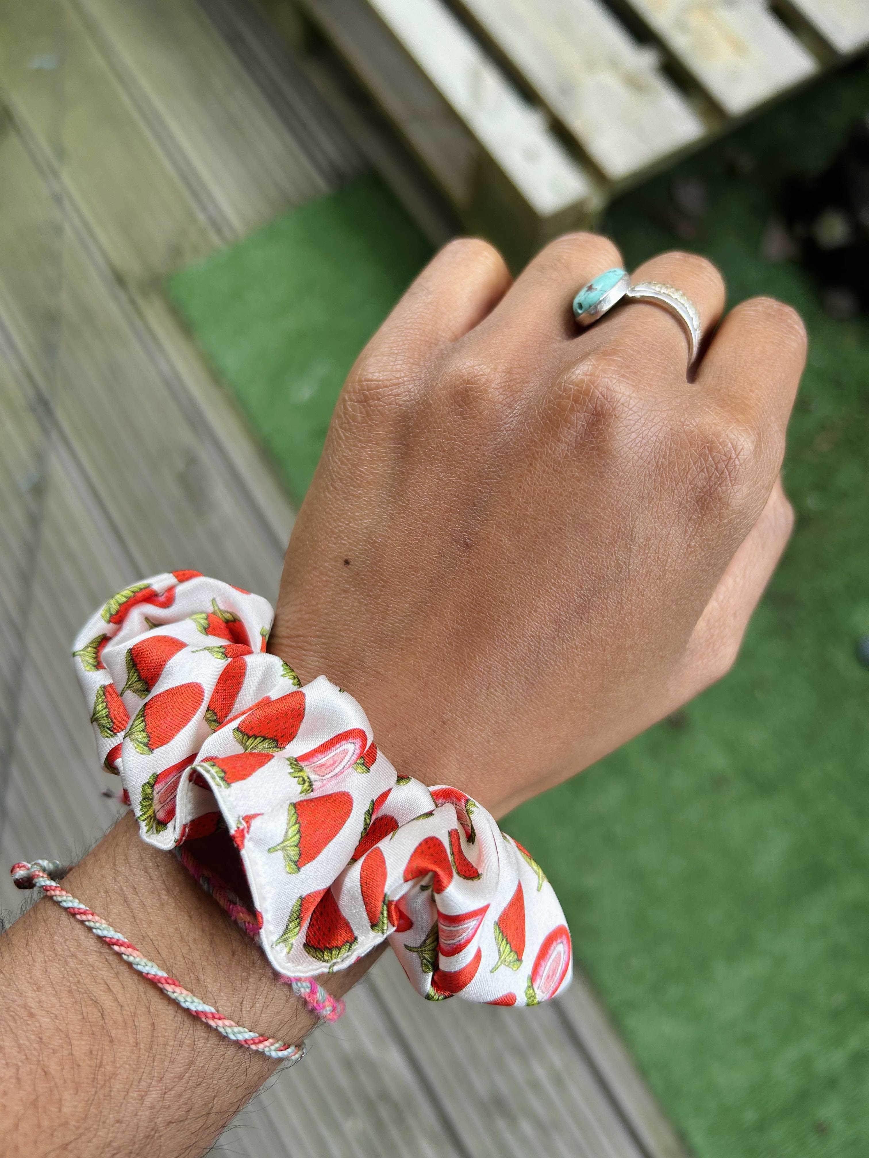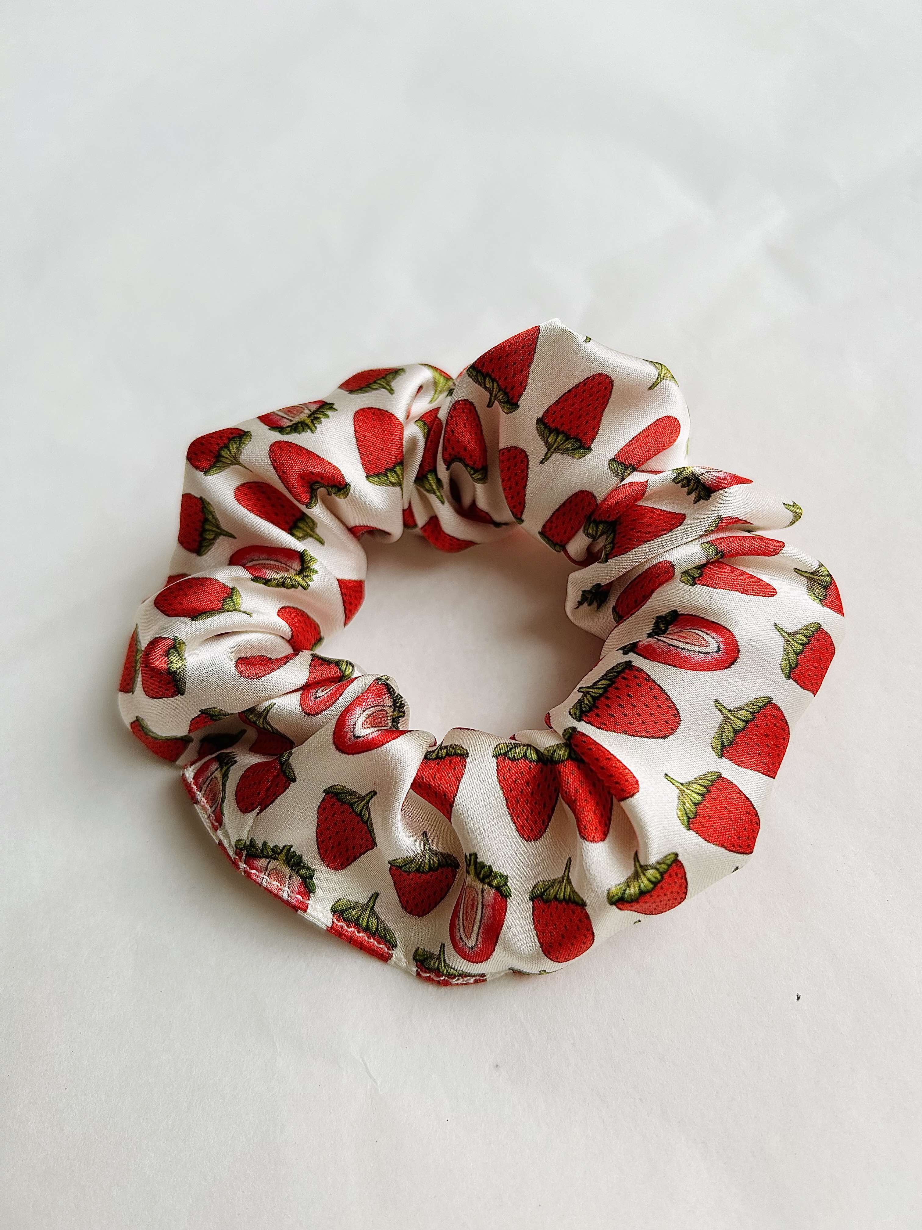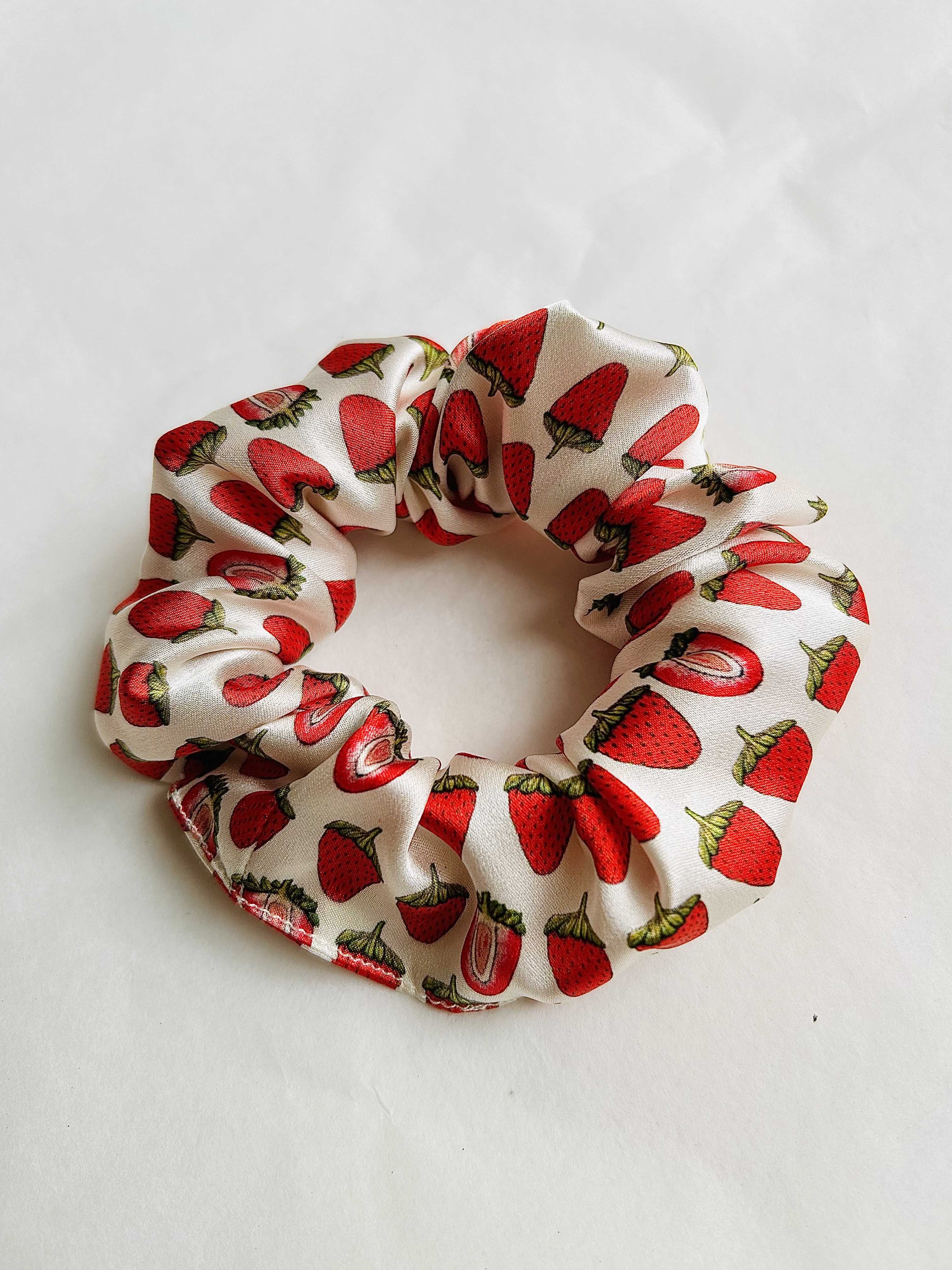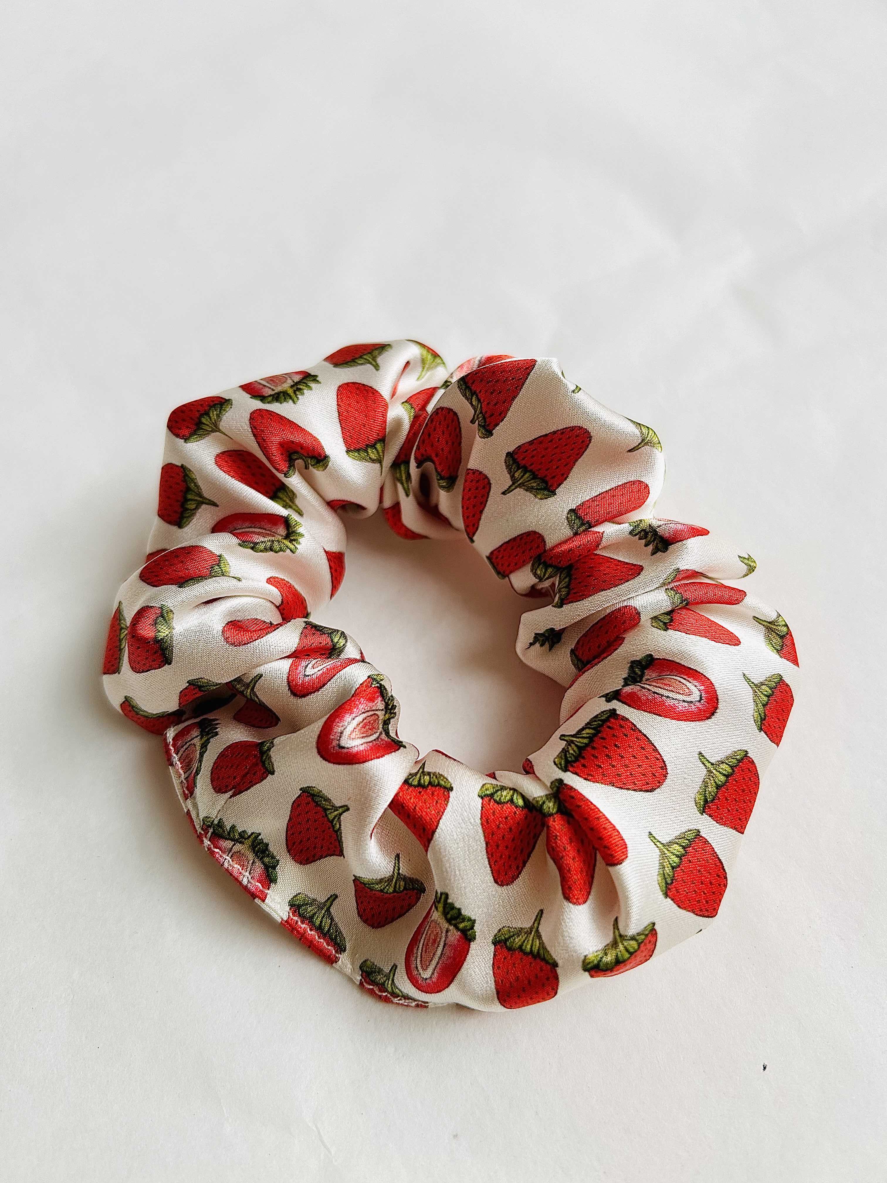 Real silk white strawberry hand-drawn scrunchie. Made in the UK