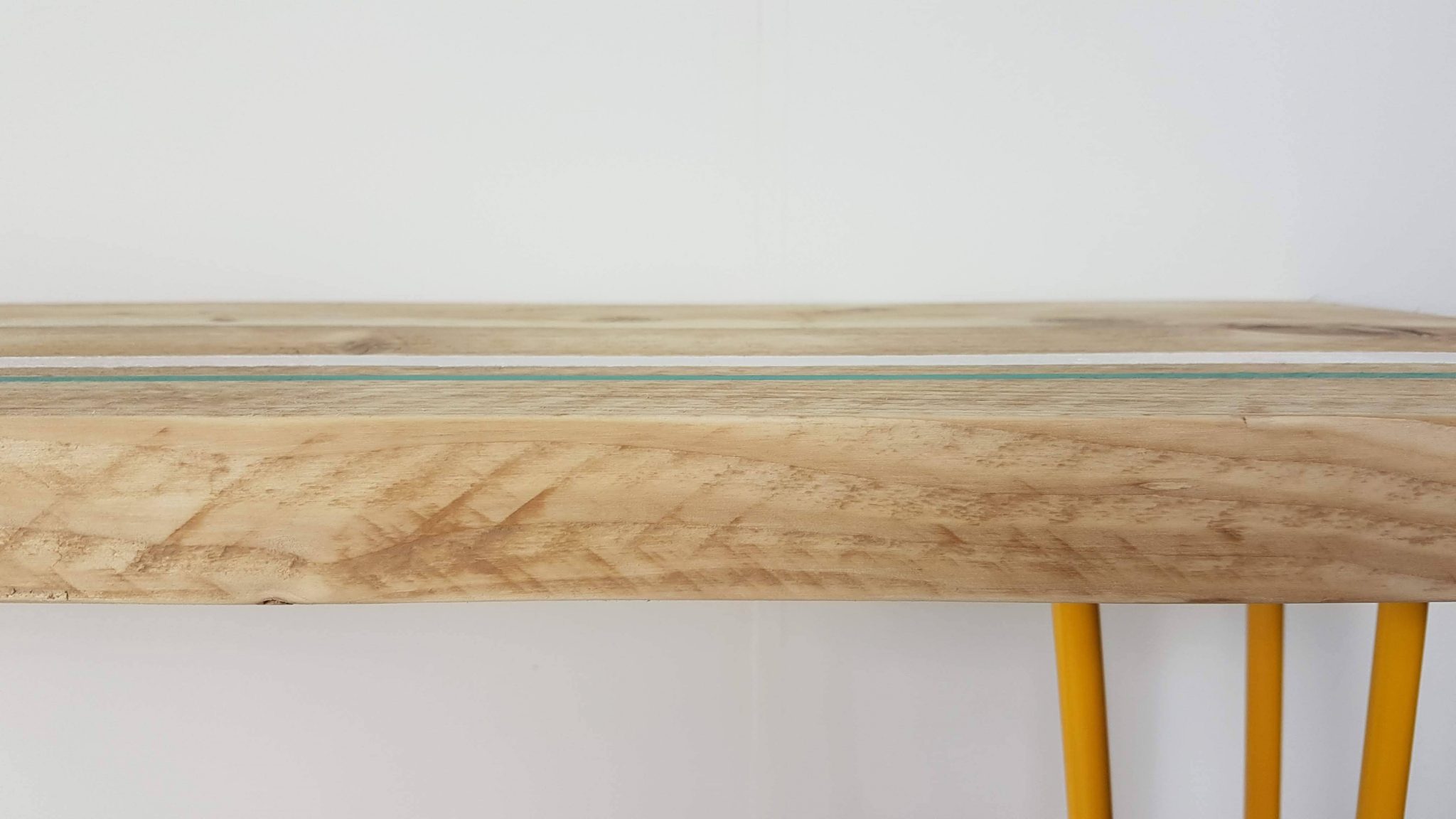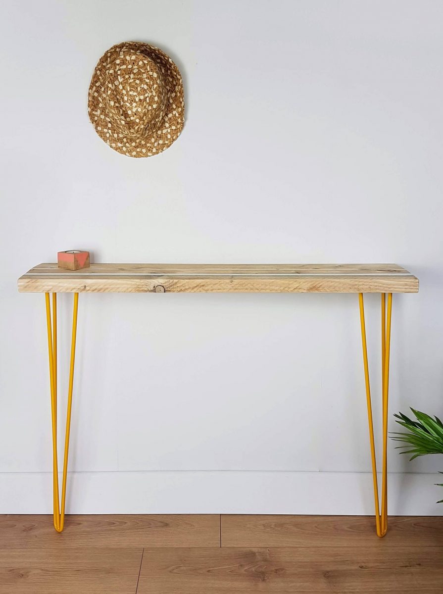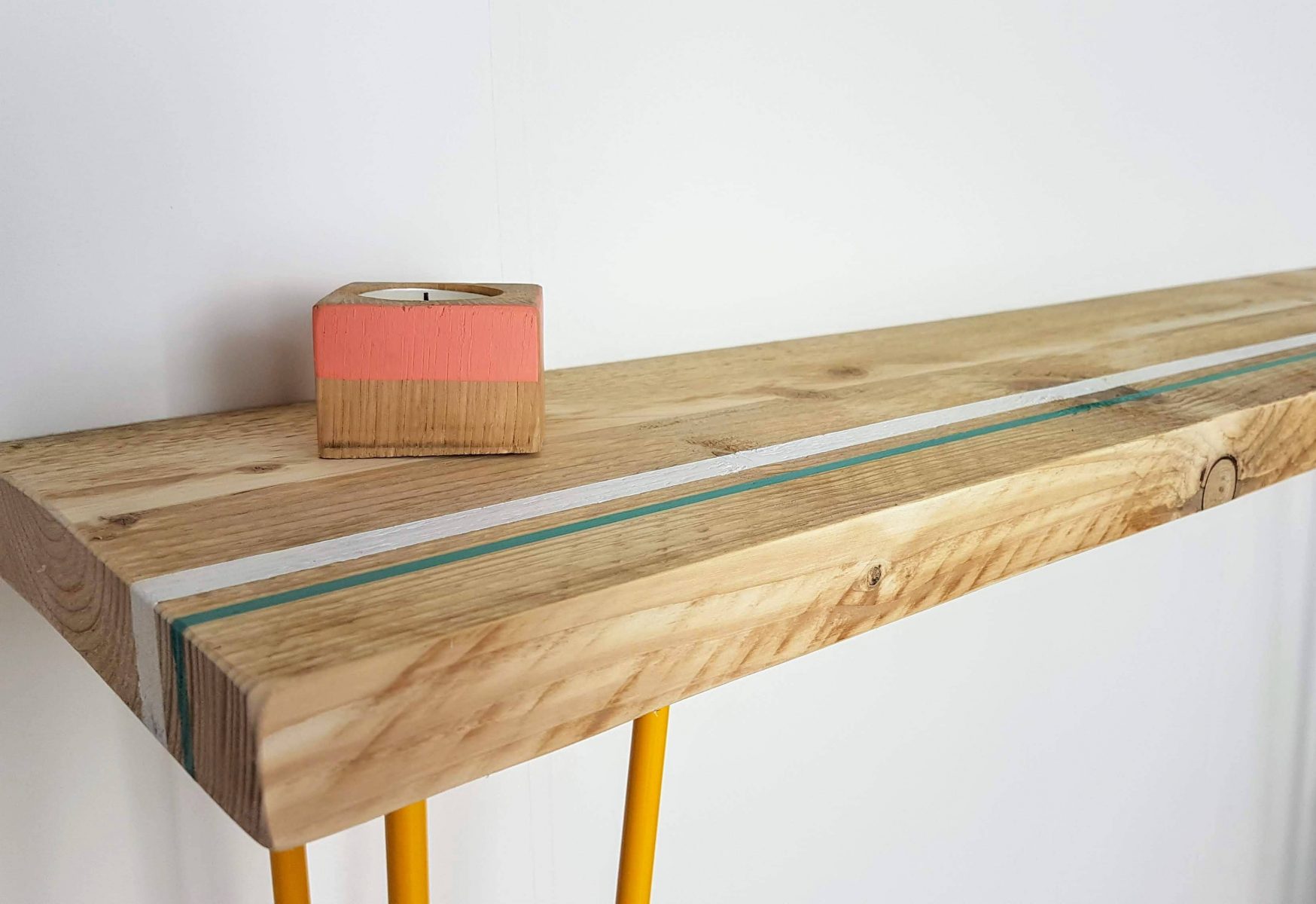 Reclaimed scaffold board console tables, painted with a triangle design. Finished with yellow powder coated steel hairpin legs from The Hairpin Leg Company. We love that contrast between fresh colours, sleek legs and rustic wood.