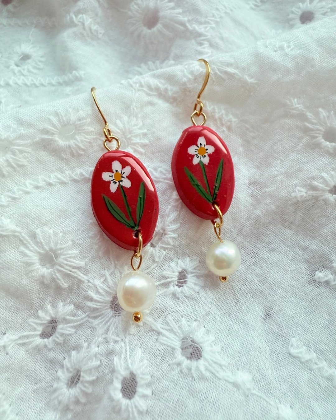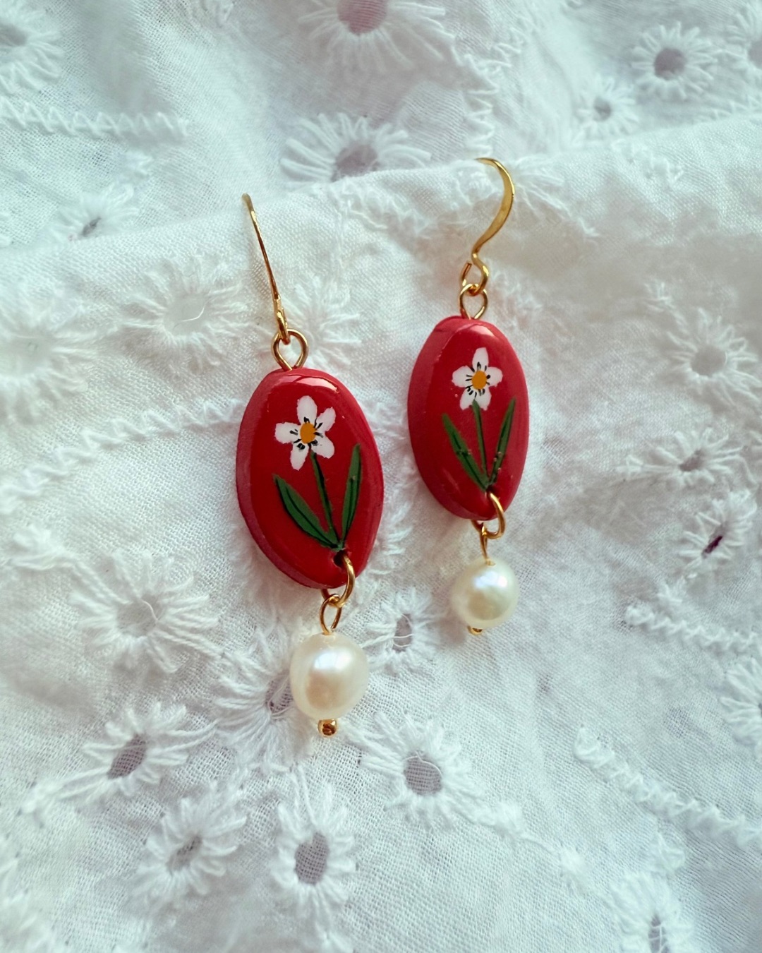 Each earring features a glossy Cherry Red oval polymer clay charm, hand painted with a delicate White daisy and Green leafy details. A natural freshwater pearl drop adds gentle movement and elegance, finished with gold-tone hooks for a warm, classic look.