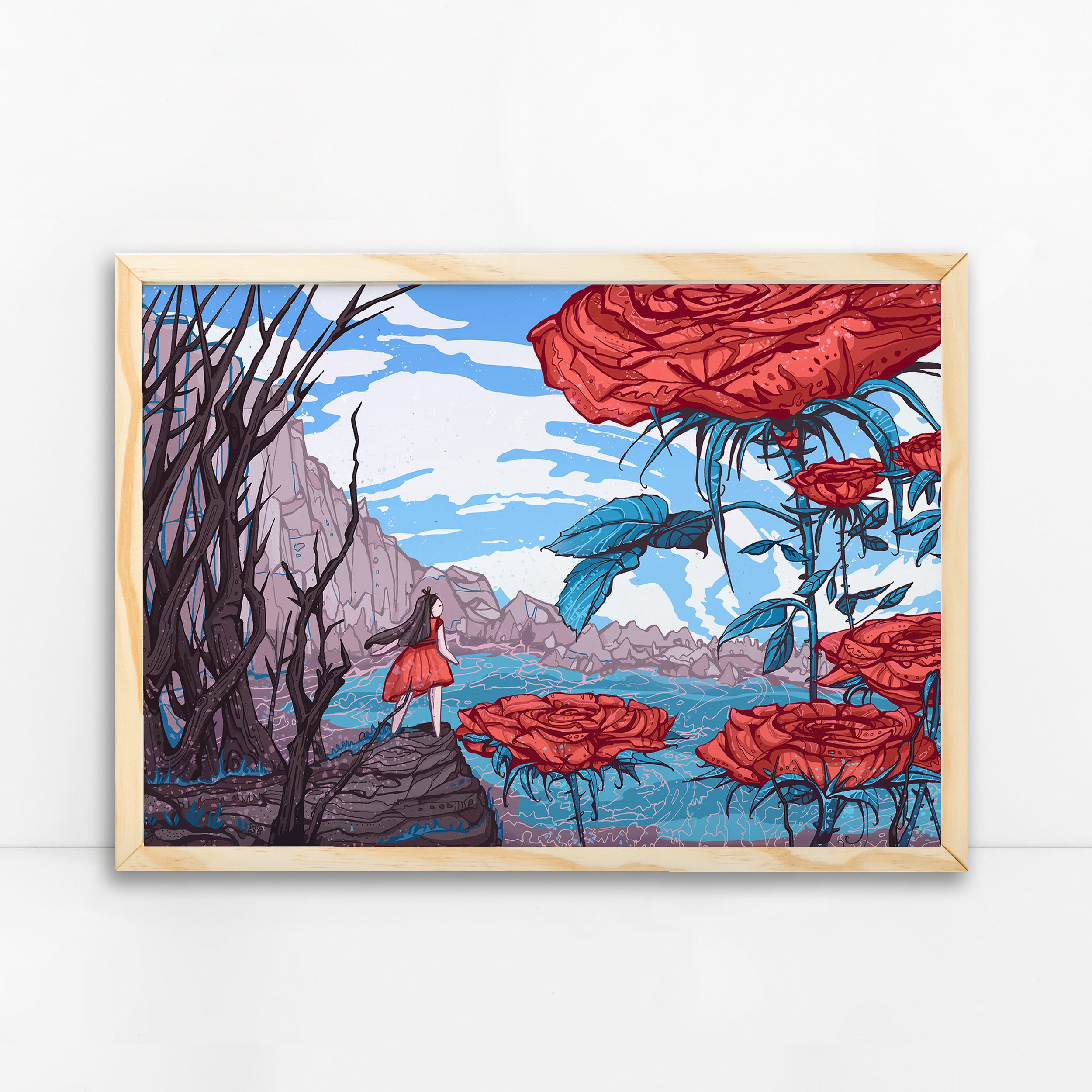 This vibrant art print presents a surreal, dreamlike landscape where a young girl in a red dress stands on a rocky ledge, gazing into a fantastical world of giant red roses. The composition plays with scale and perspective, as the oversized roses tower around her, almost like trees, and feature intricate details in the petals and leaves.