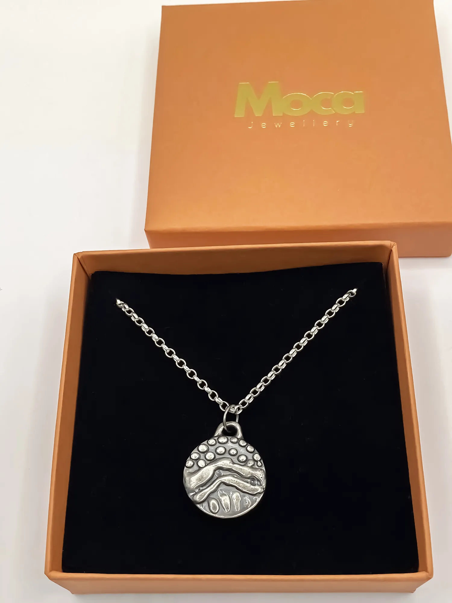 Each piece is meticulously cast in London’s iconic Hatton Garden using the ancient lost-wax casting method. This traditional technique ensures every pendant is entirely unique, with slight variations that reflect the individuality of its wearer. The textured surface and carefully considered proportions lend the piece a tactile quality that enhances its timeless appeal.