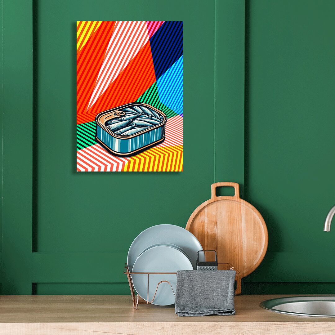 Join me in celebrating two of my greatest passions: cooking and art. Inspired by the iconic Op Art of Bridget Riley on her birthday, I’ve created a unique giclée print that playfully incorporates a tin of sardines. Reminiscent of Fridays from my youth, traditionally known as fish day, this print is a tribute to both culinary and artistic creativity.
