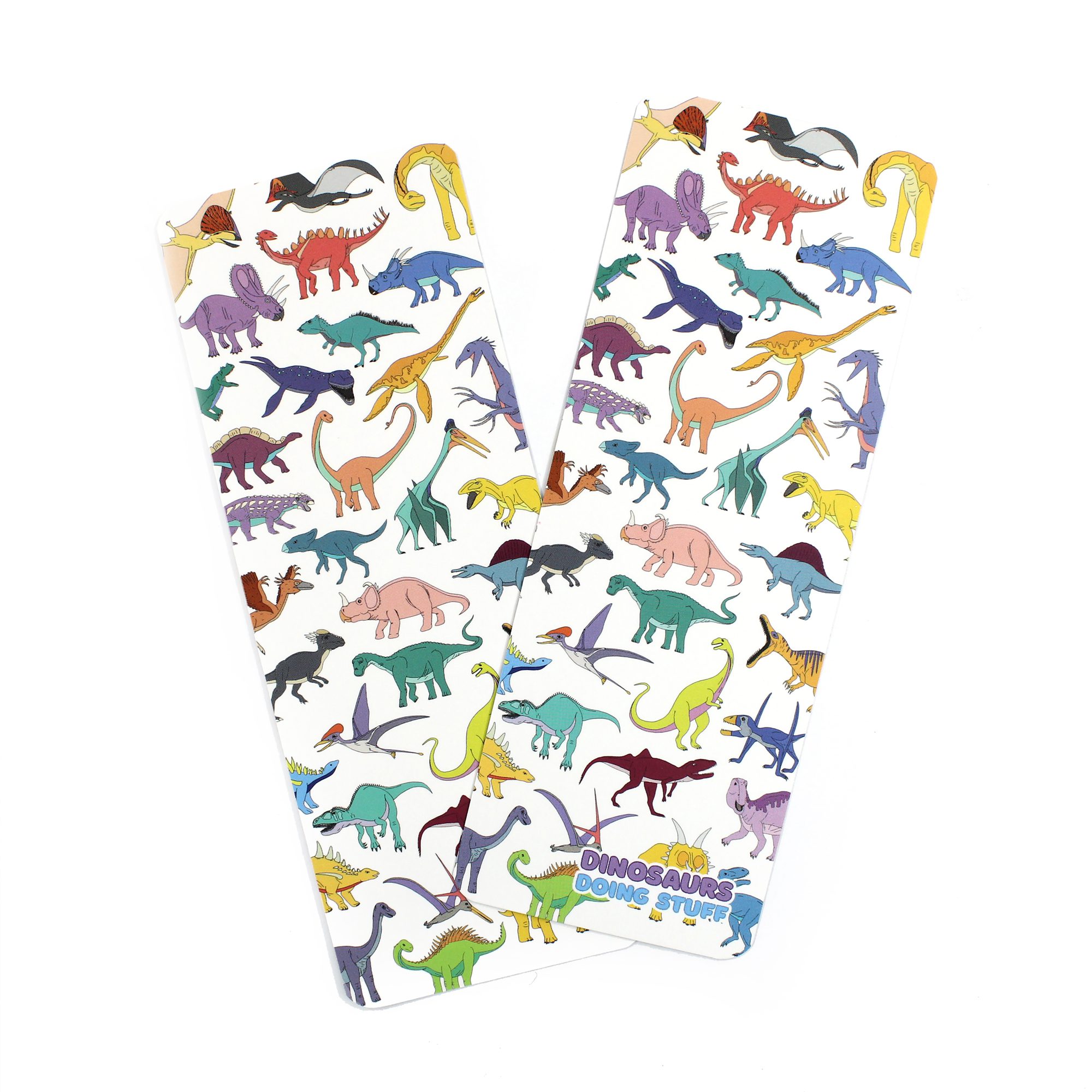 The design is the same on the front and back. Each bookmark features my ‘Dinosaurs Doing Stuff’ logo at the bottom on one side (this hides some of the design).