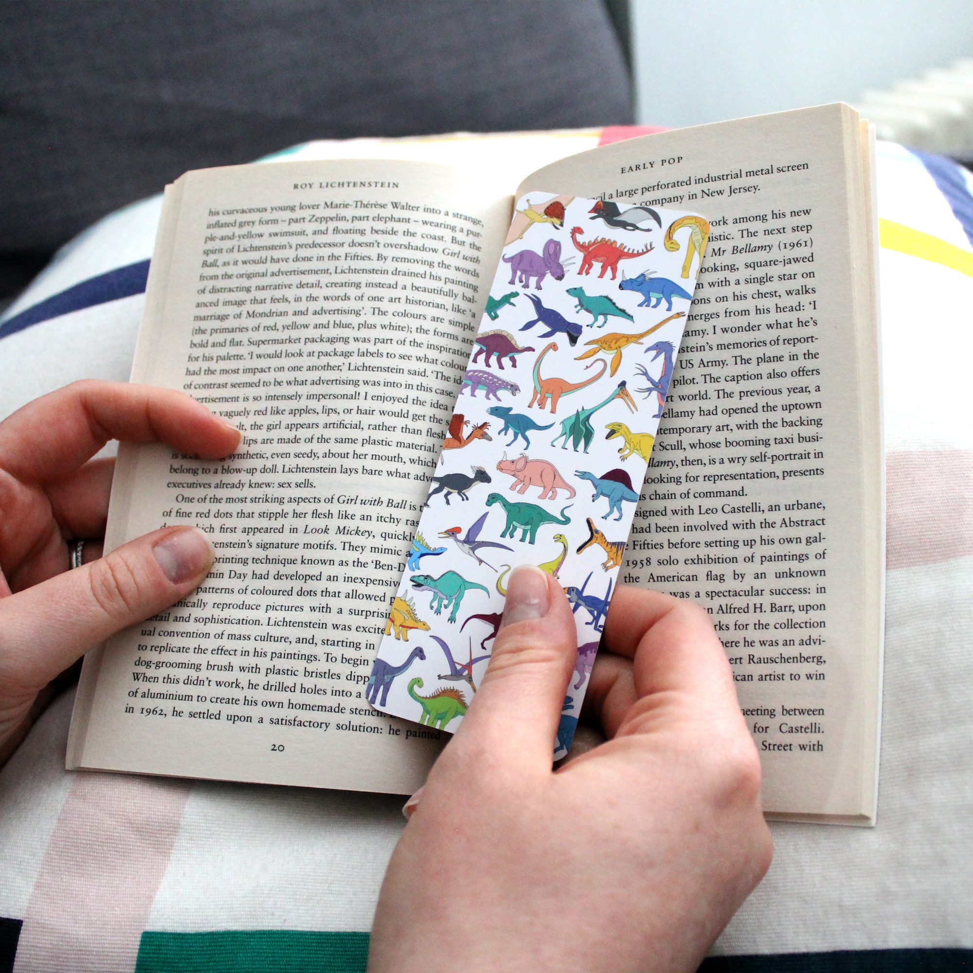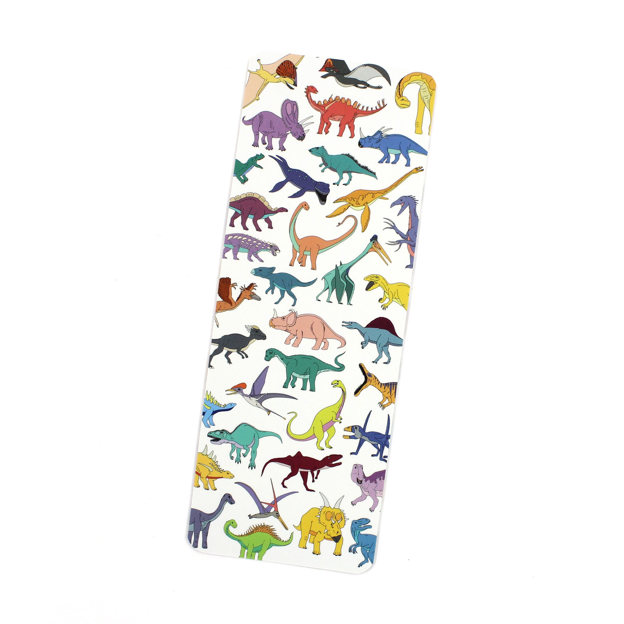 Featuring over 30 colourful dinosaurs, flying reptiles and swimming reptiles scattered across the bookmark. The design is on a white background.