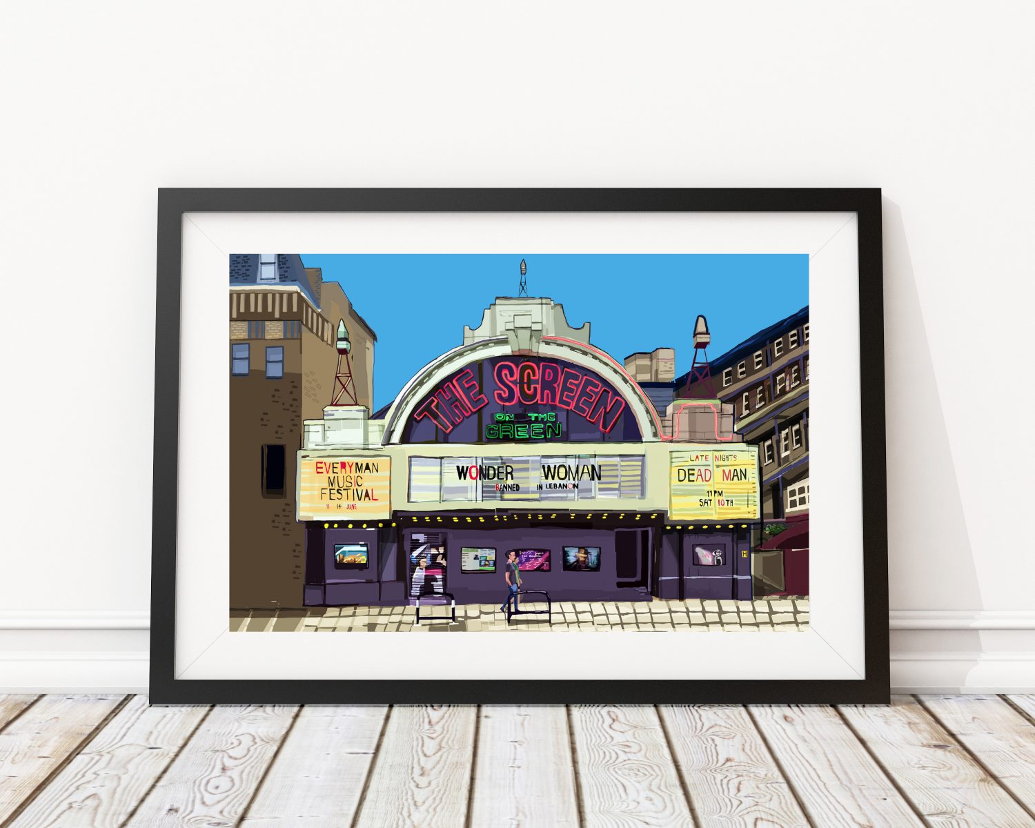 Celebrate one of London’s most iconic cinemas with this beautifully illustrated Screen on the Green Everyman Cinema Print. This art print captures the historic charm and vibrant character of Islington’s beloved cinema, bringing a slice of London culture into your home. Perfect for film enthusiasts or lovers of London’s unique architecture, this print showcases the cinema’s famous facade with rich colors and intricate details.