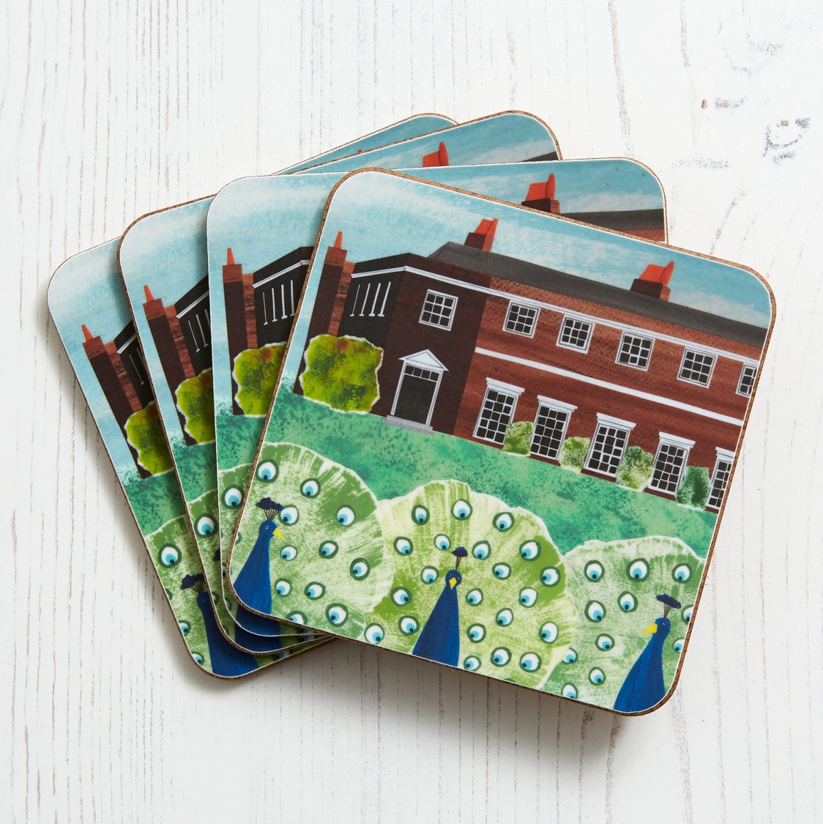 This coaster design features an illustration of Fulham Palace, based on an original collage, finished off with some charming peacocks.