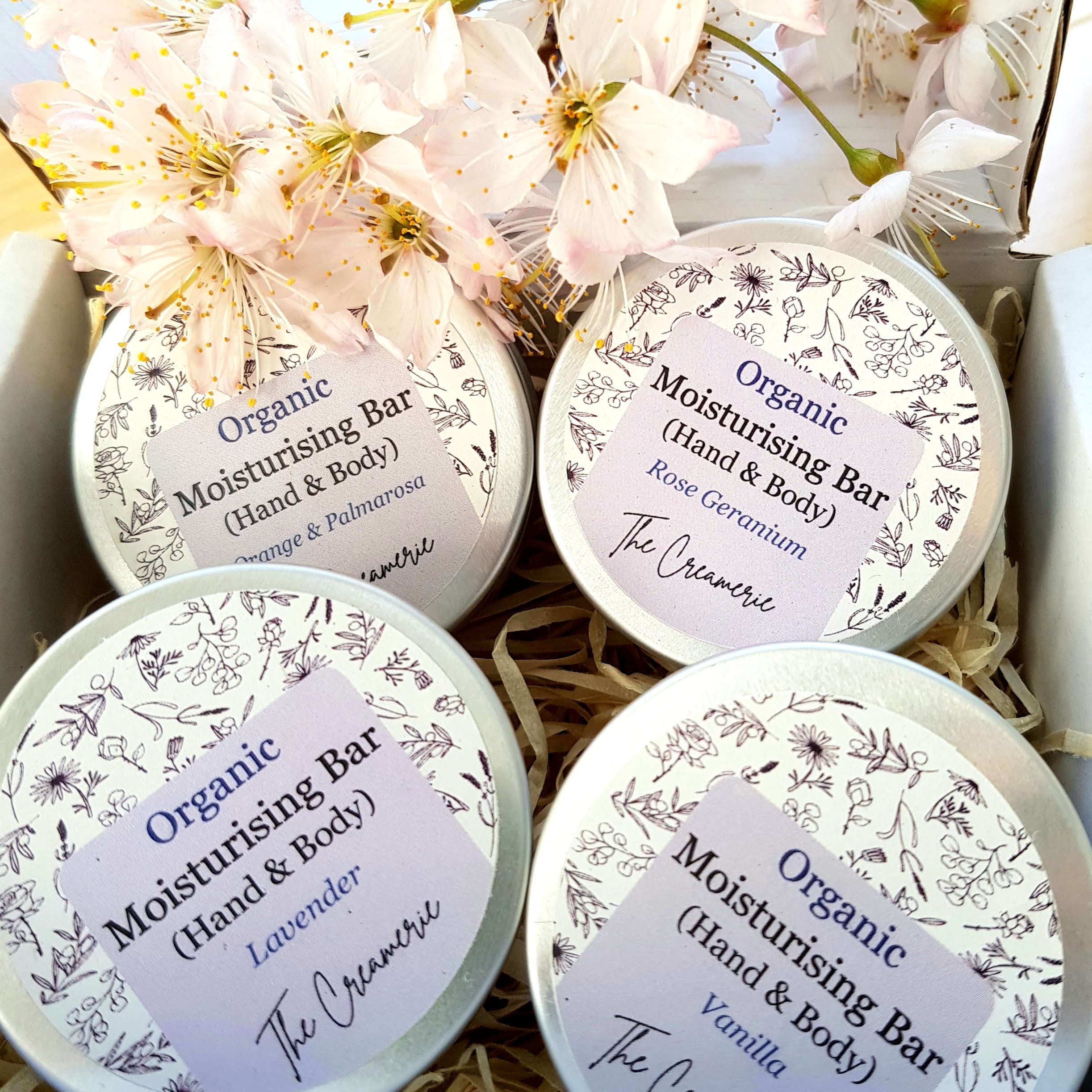 If you do not like to choose and would rather try all the options… this set of four small moisturising bars (c. 13g each) is made for you! Just pop the little tins in your pocket or bag and use them by rubbing them in your hands to keep your hands soft and smooth.