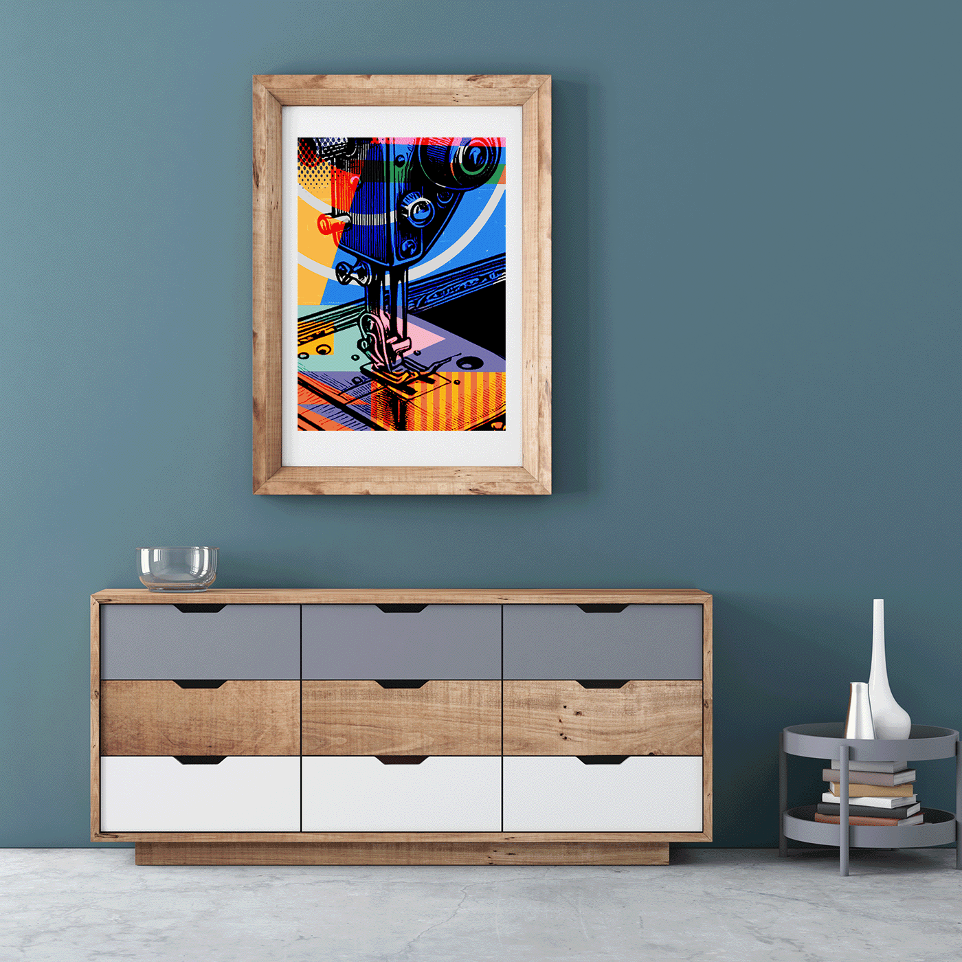 Each print is meticulously hand-signed and carefully packaged in acid-free tissue paper and a durable card sleeve or tube, ensuring it arrives in pristine condition. Perfect for craft enthusiasts or lovers of modern decor, “Sewing Machine 01” infuses creativity and warmth into any room.