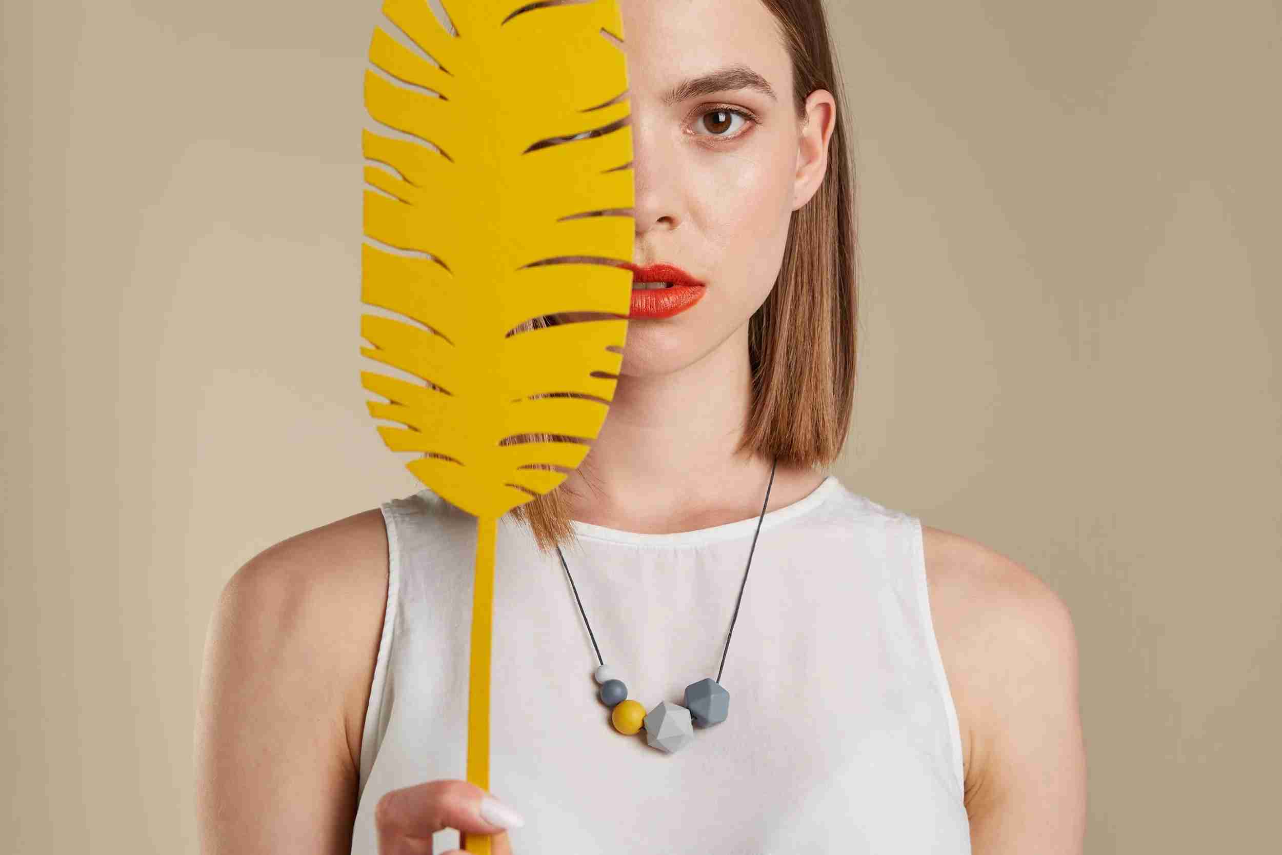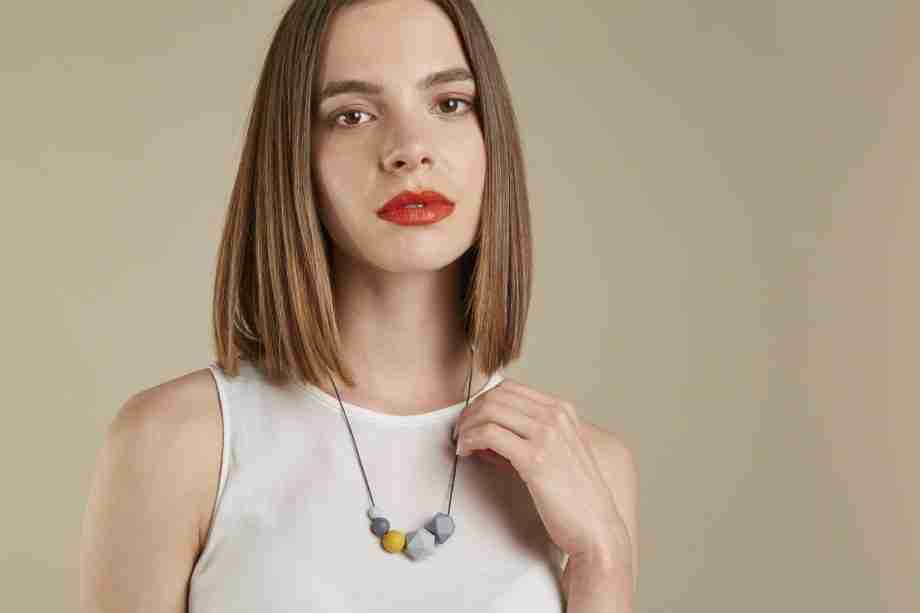This necklace embodies Kodes: grey and mustard yellow flag colors, ideal for lovers of quirky jewelry pushing boundaries with style. Designed to accessorize somber workwear, it highlights silicone’s quirkiness while maintaining a modern aesthetic through its geometric design.