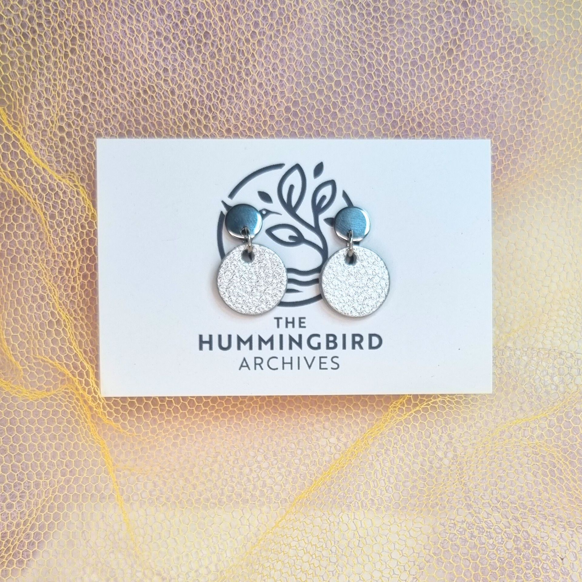 Crafted using leather offcuts, these particular earrings are from a handbag maker. They are part of a sustainable, small-batch production process that helps minimise waste. The silver leather used has a soft metallic sheen with a fine crackle texture that catches the light beautifully. Each pair is carefully assembled by hand: the leather is glued together for a double-sided design then precision-cut into perfect circles, hand-punched, and sealed with a protective coating to ensure smooth edges and durability.