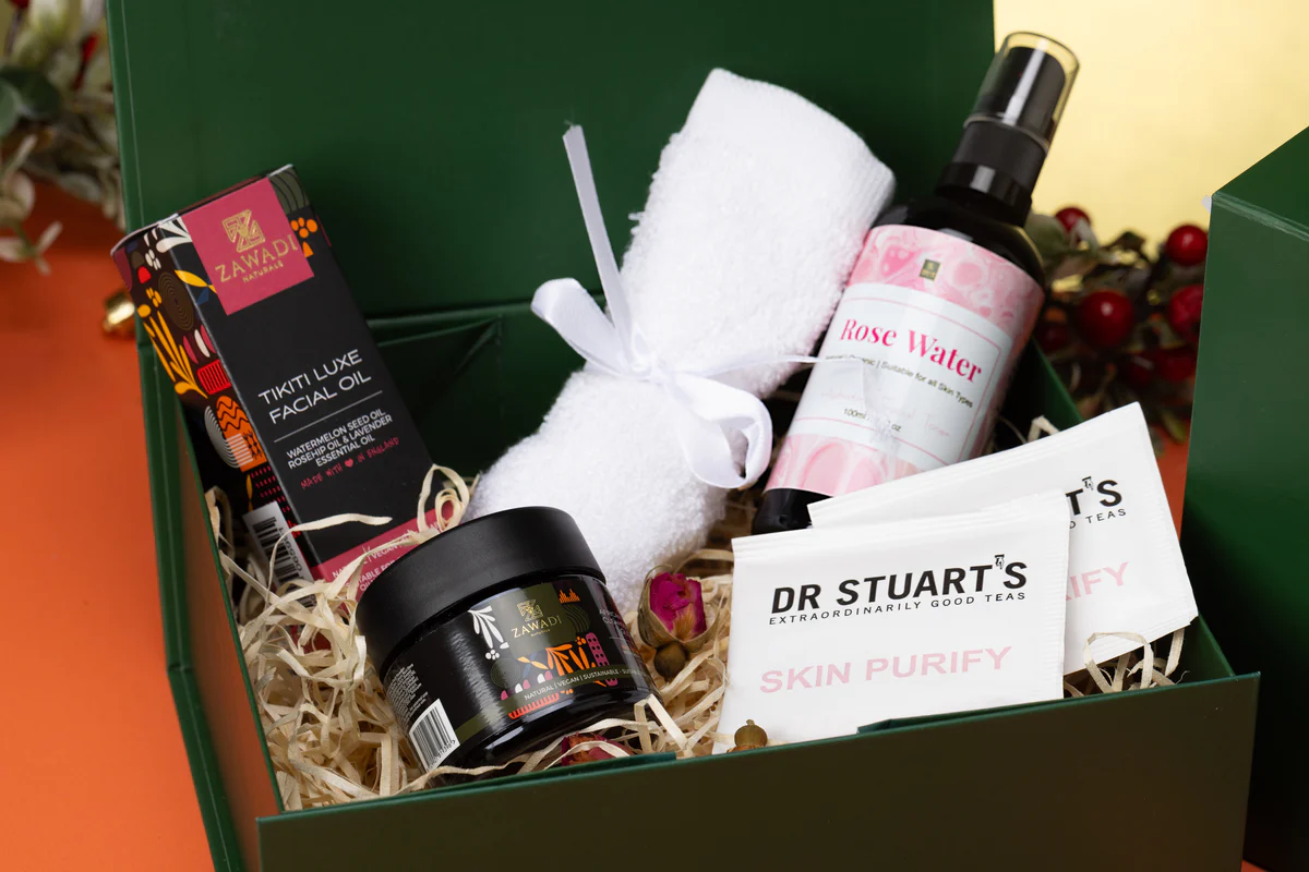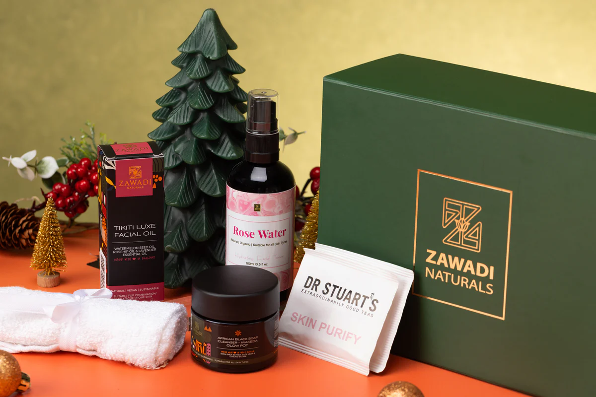 The perfect self-care gift is a luxurious skincare gift box featuring Tikiti Luxe facial oil, Makeda Glow Pot, a soft face towel, and other natural skin-loving treats.