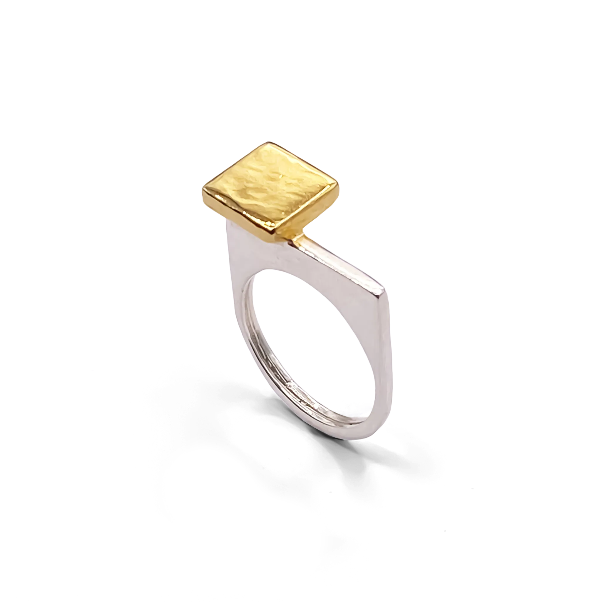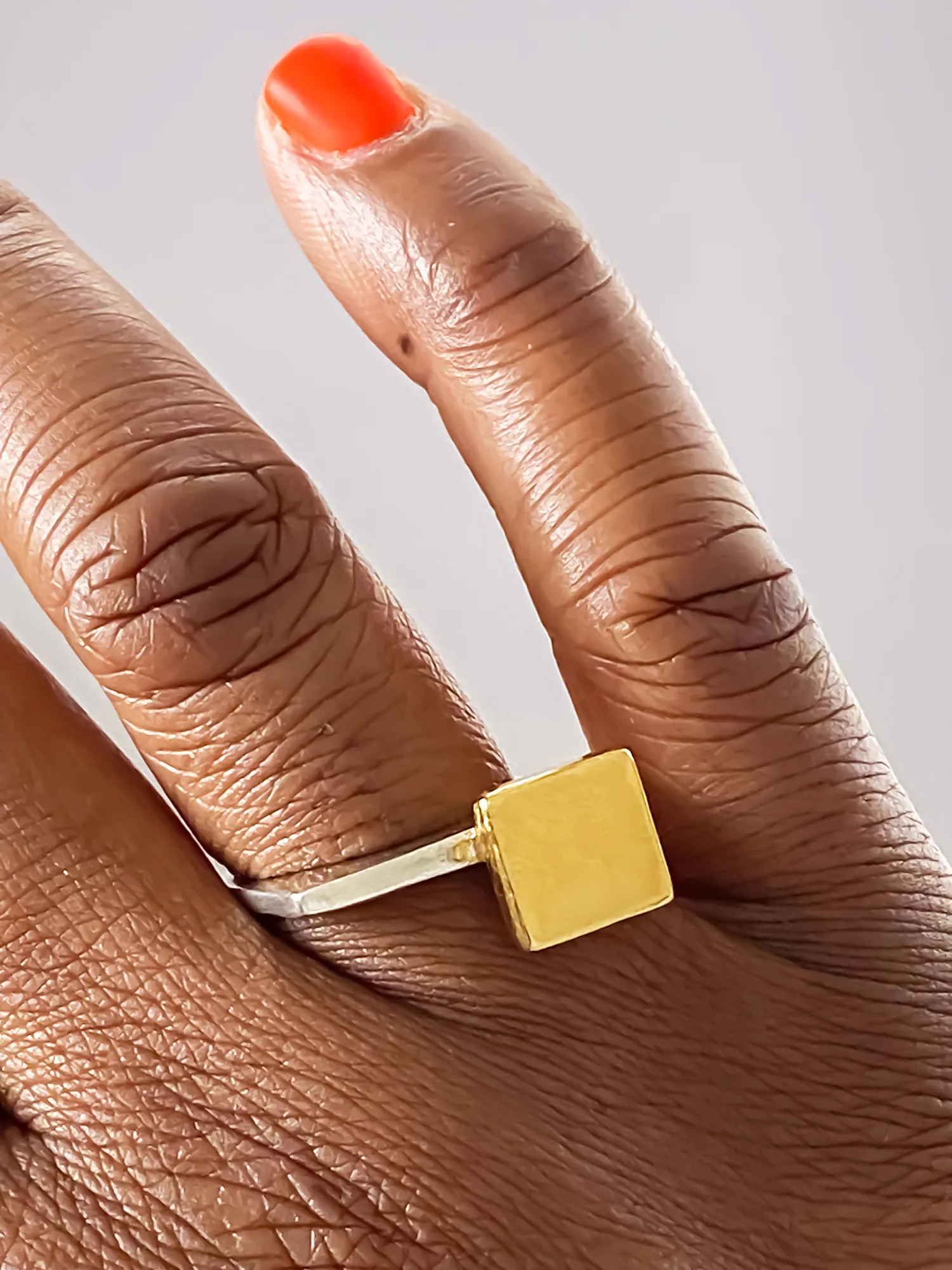 The ring is available in your choice of recycled .925 sterling silver or warm 18ct gold vermeil – both beautiful, sustainable options that align with MOCA’s commitment to conscious design. Measuring 21 mm wide and 5 mm high across the face, the square top offers a sleek, architectural feel. A bevel height of 12 mm and a 3 mm band thickness give the ring just enough presence, without overwhelming the hand.
