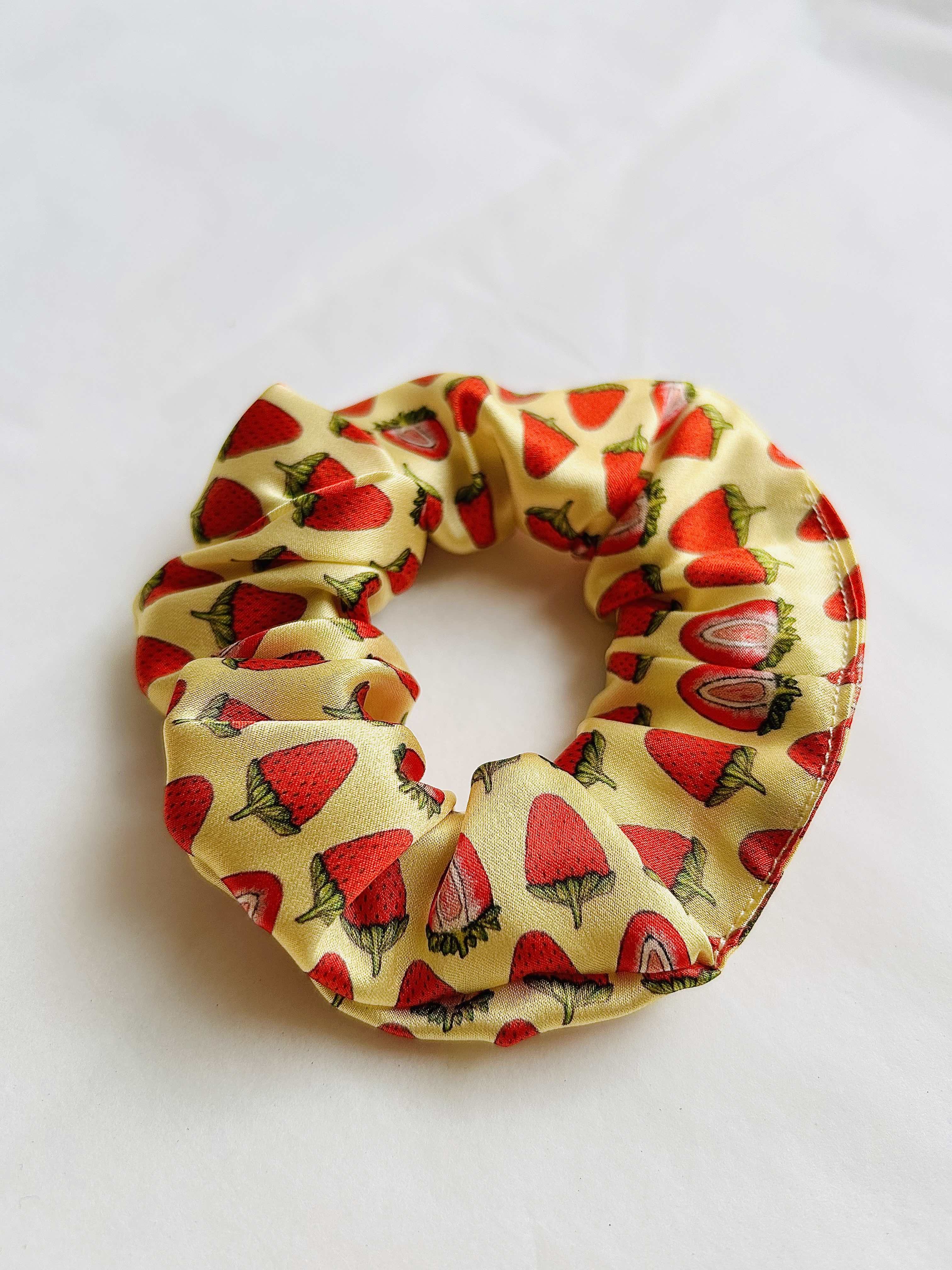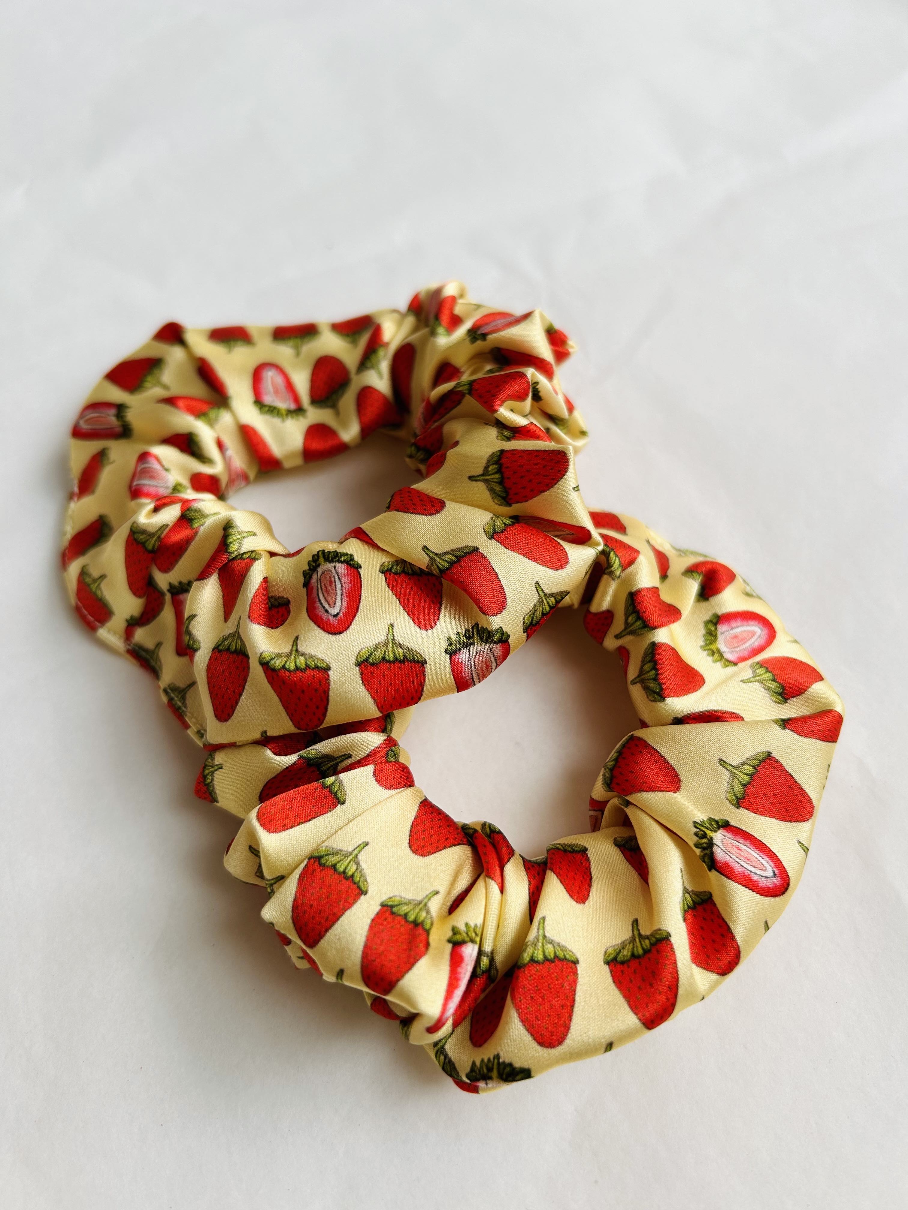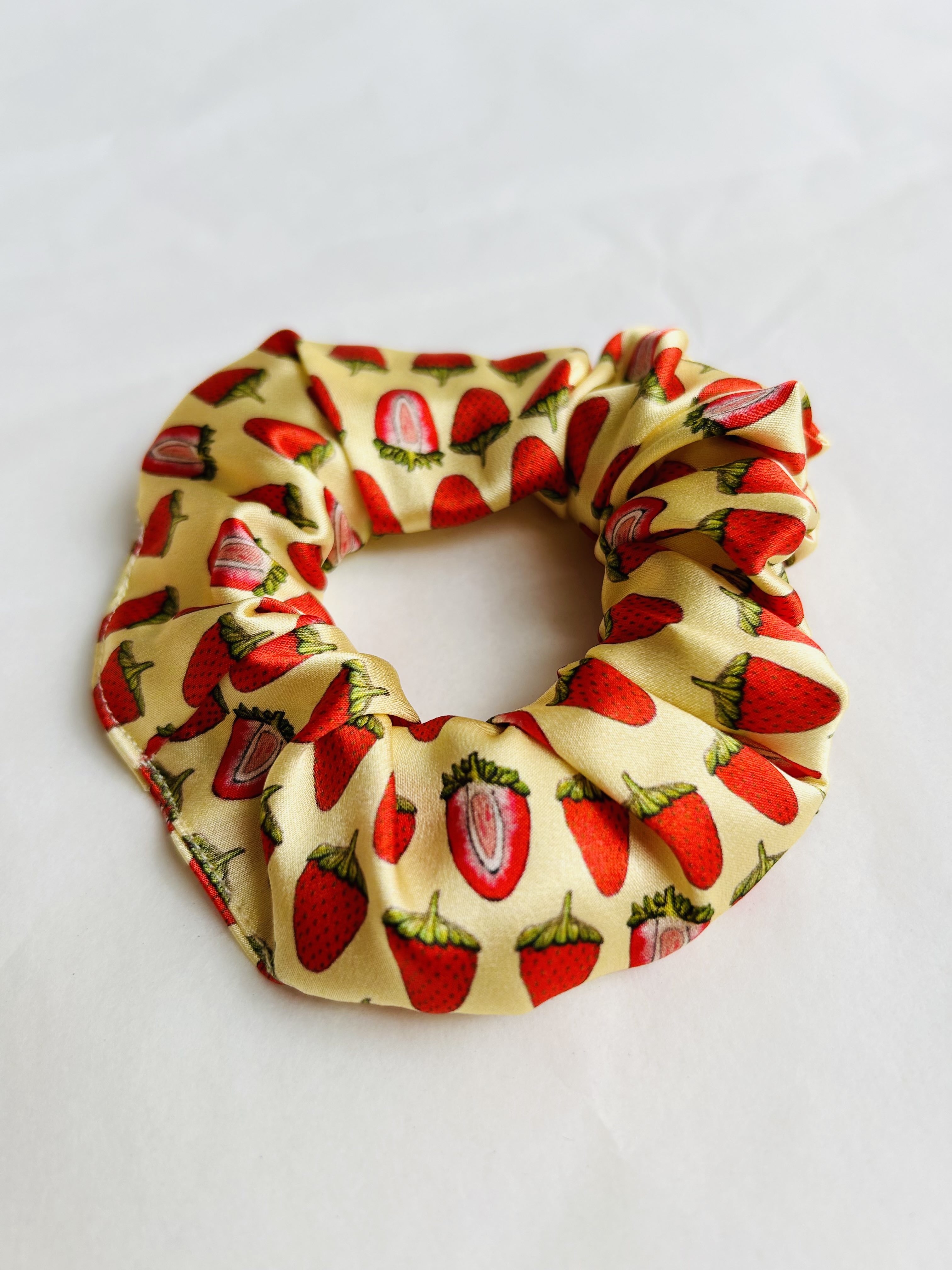 Indulge in the elegance of our Strawberries and Cream Silk Scrunchie, crafted from premium real silk with a soft yellow strawberry cream print that adds both sophistication and fun to your hairstyle. The pure silk fabric provides a gentle, satin-smooth texture that minimizes frizz and helps prevent hair breakage, making it ideal for keeping hair healthy and sleek.