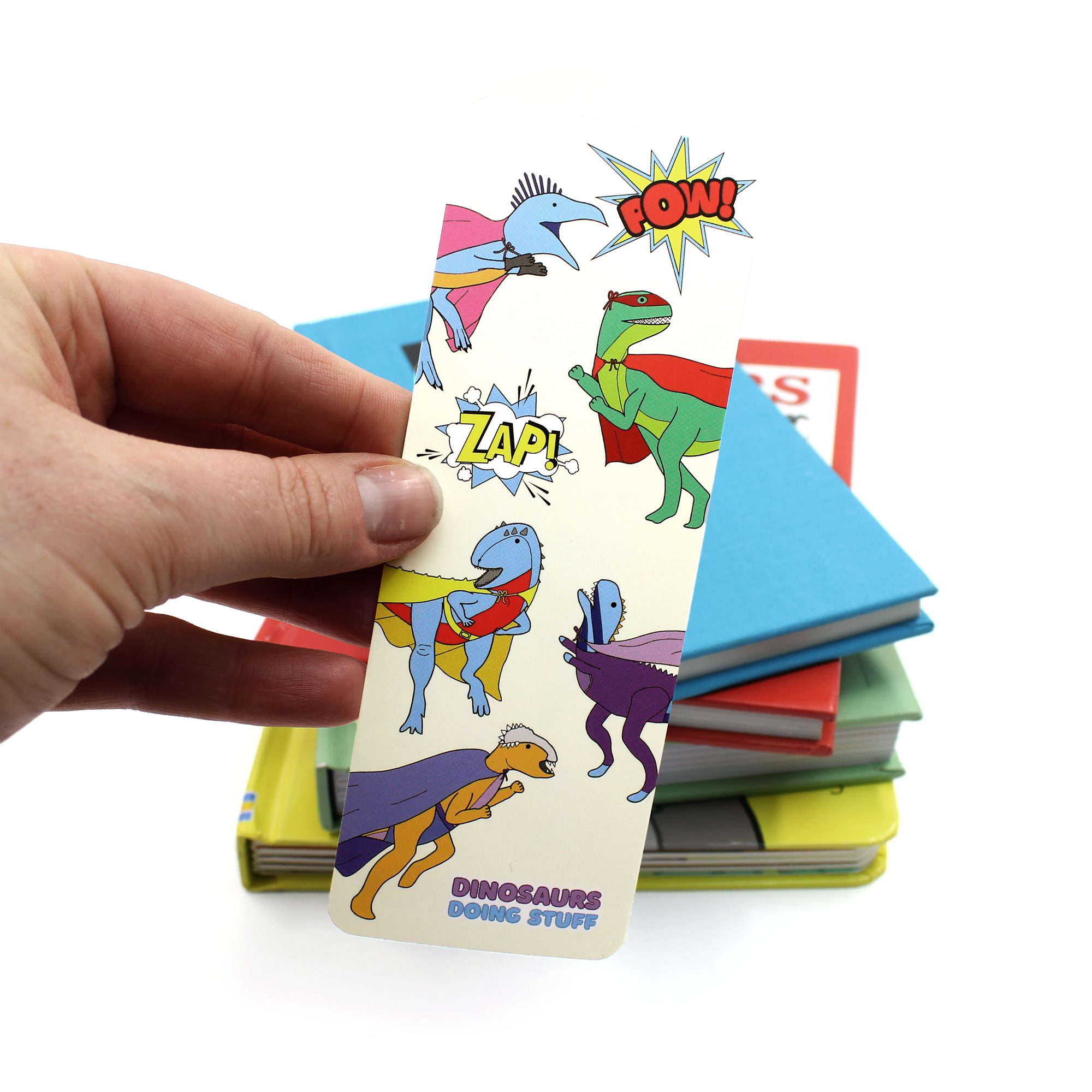 The design is the same on the front and back. Each bookmark features my ‘Dinosaurs Doing Stuff’ logo at the bottom on one side (this the word SUPER on the back).
