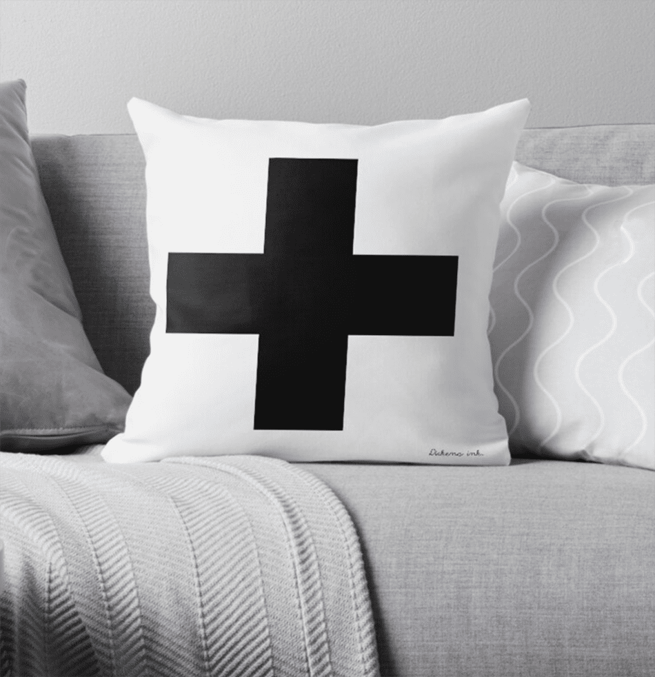 This decorative cushion features my Swiss cross design. This one has a large black cross (plus signs) on a white background. I also have the reverse – black on white – please see my other listing. They look great as a pair. Both come with black backing fabric like the photos