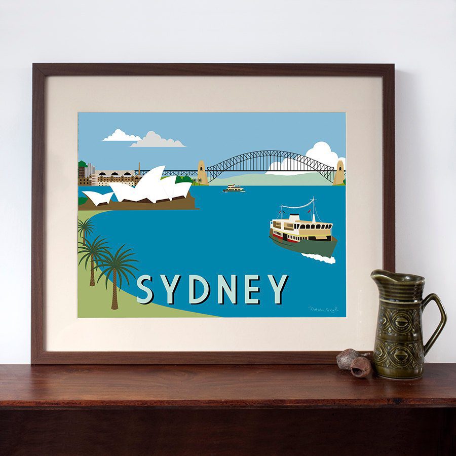 Retro travel poster style print of Sydney Harbour depicting Sydney Harbour Bridge, Opera House and harbour, with ferries and palm trees, and a snippet of the Rocks. A bright sunny day and lovely to be out and about in Sydney.