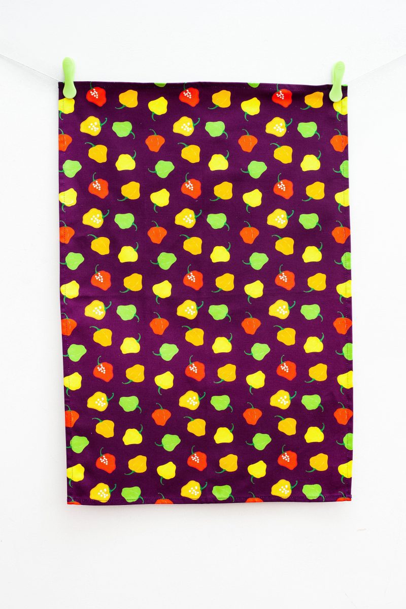 Tea towel with scotch bonnet pepper in plum background colour